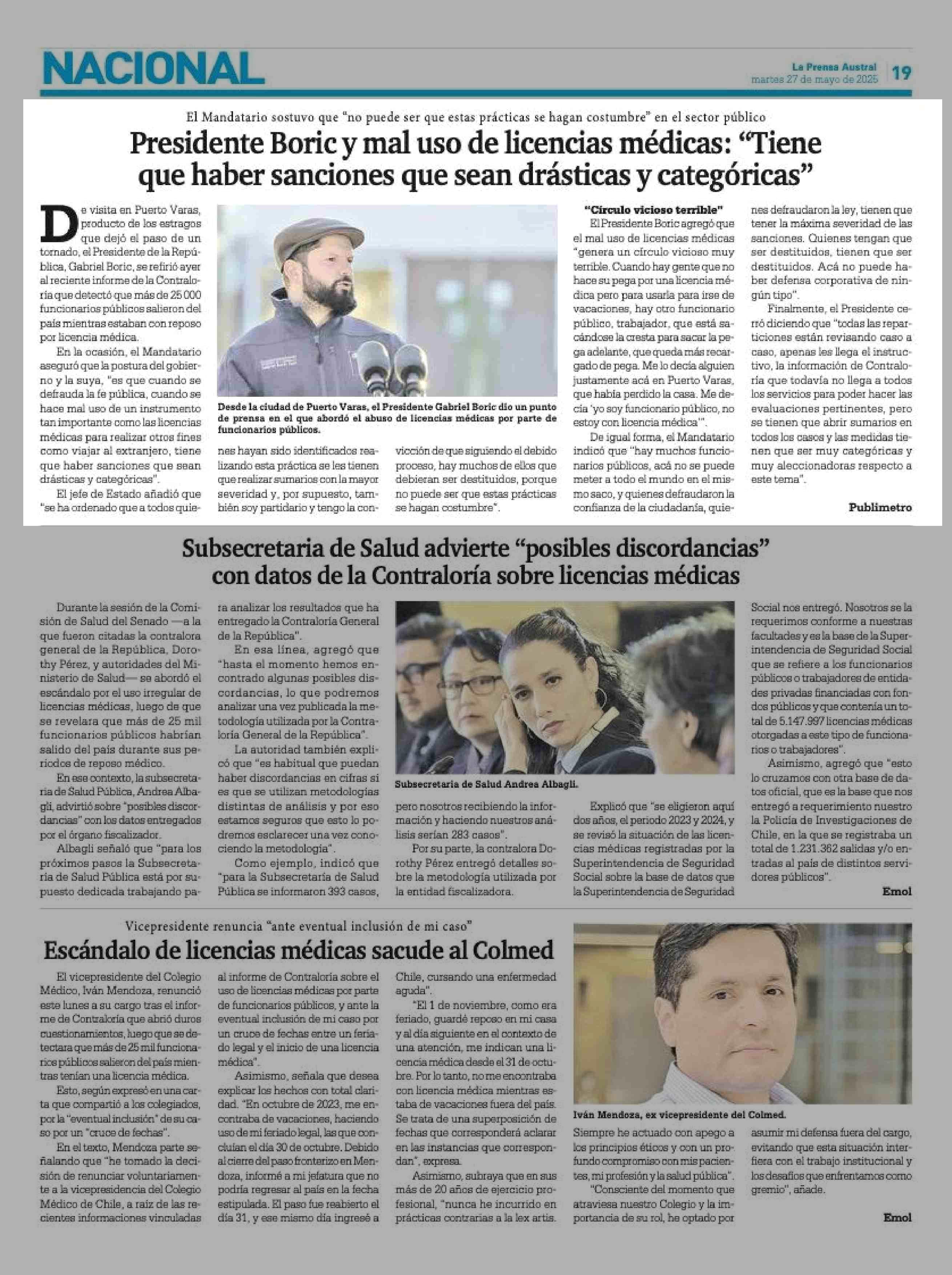 Presidente Boric y mal uso de licencias médicas: “Tiene que haber sanciones que sean drásticas y categóricas” 27-05-2025 La Prensa Austral |