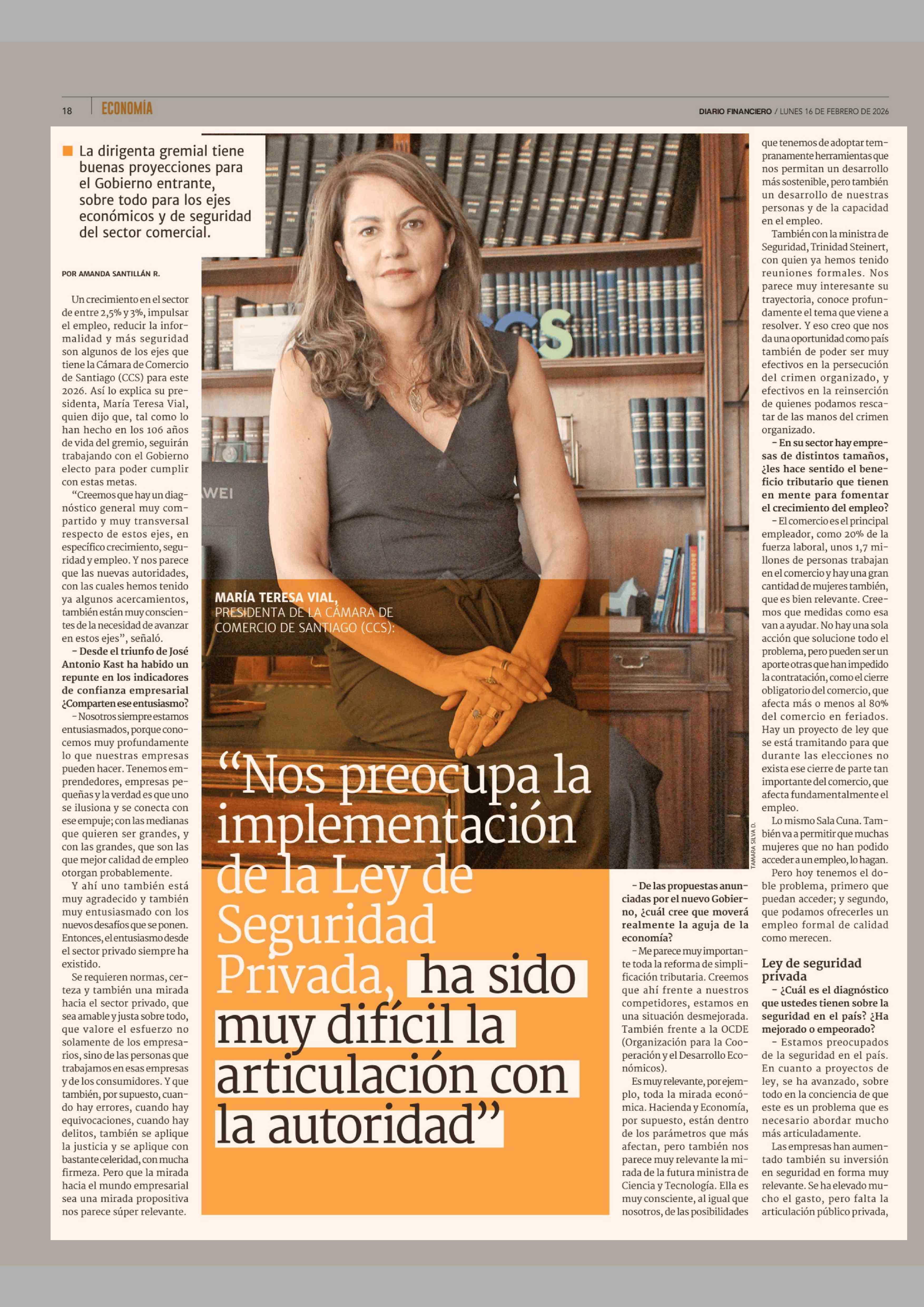 "Nos preocupa la implementación de la Ley de Seguridad Privada, ha sido muy difícil la articulación con la autoridad" 16-02-2026 Diario Financiero |
