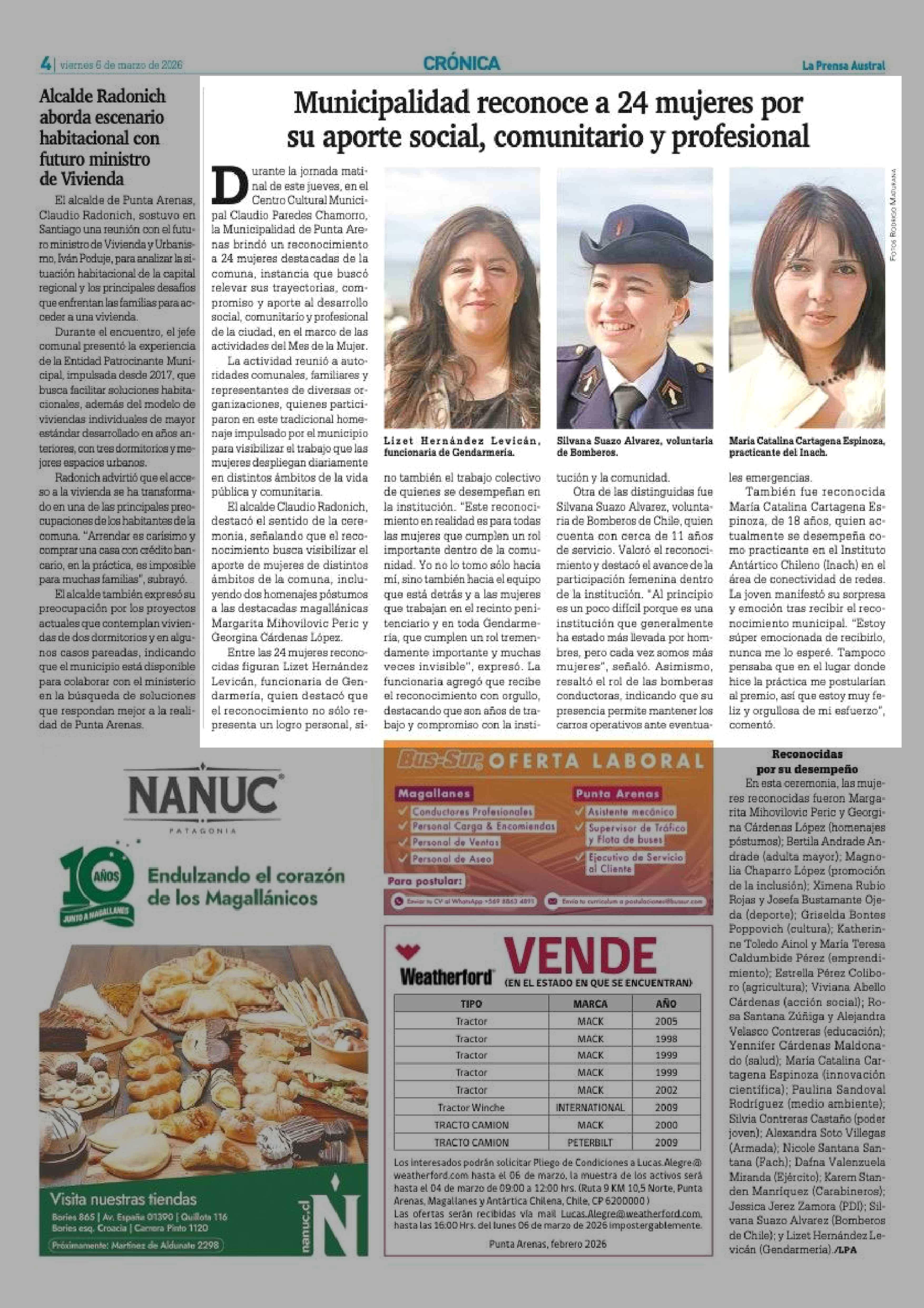 Municipalidad reconoce a 24 mujeres por su aporte social, comunitario y profesional 06-03-2026 La Prensa Austral |