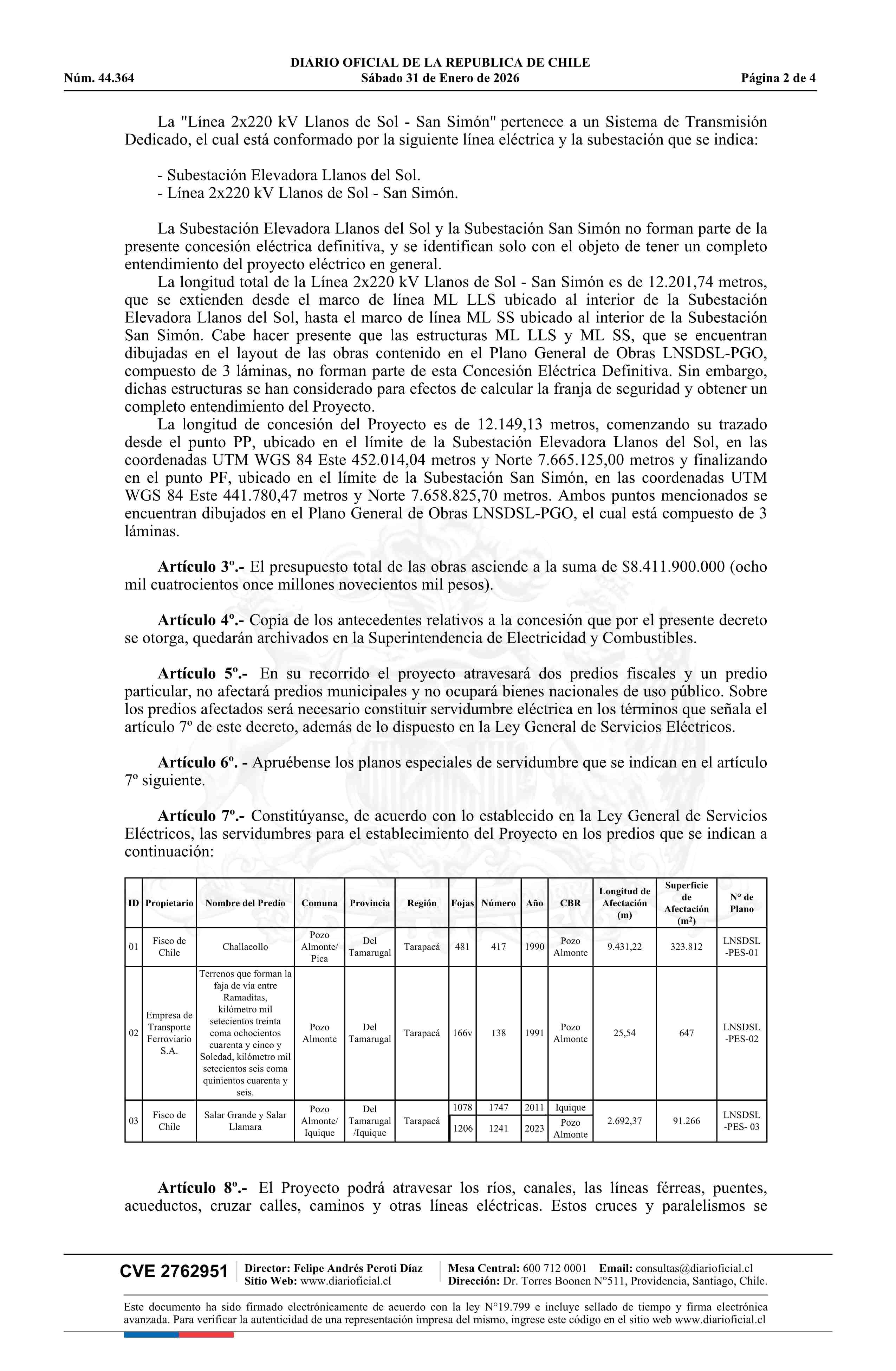 Título: Decreto exento número 21, de 2026.- Otorga a Llanos del Sol SpA concesión eléctrica definitiva para establecer las instalaciones de transmisión de energía eléctrica correspondientes al proyecto denominado Línea 2x220 kV Llanos de Sol - San Simón, en la Región de Tarapacá, provincia del Tamarugal, co