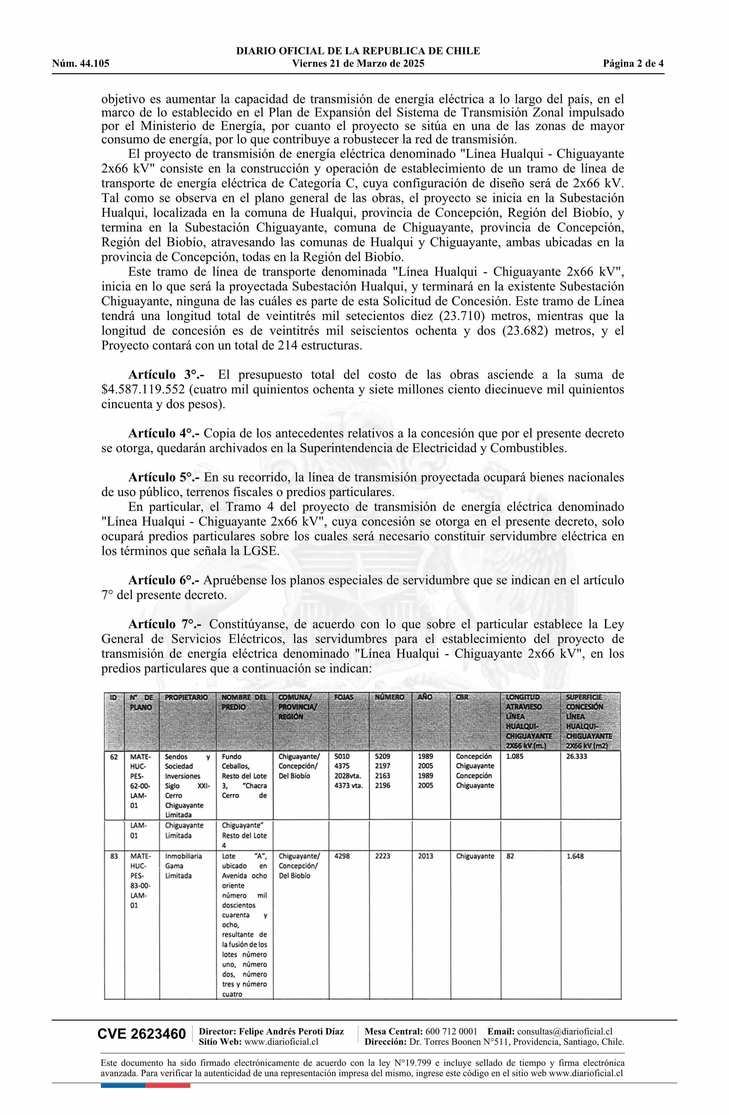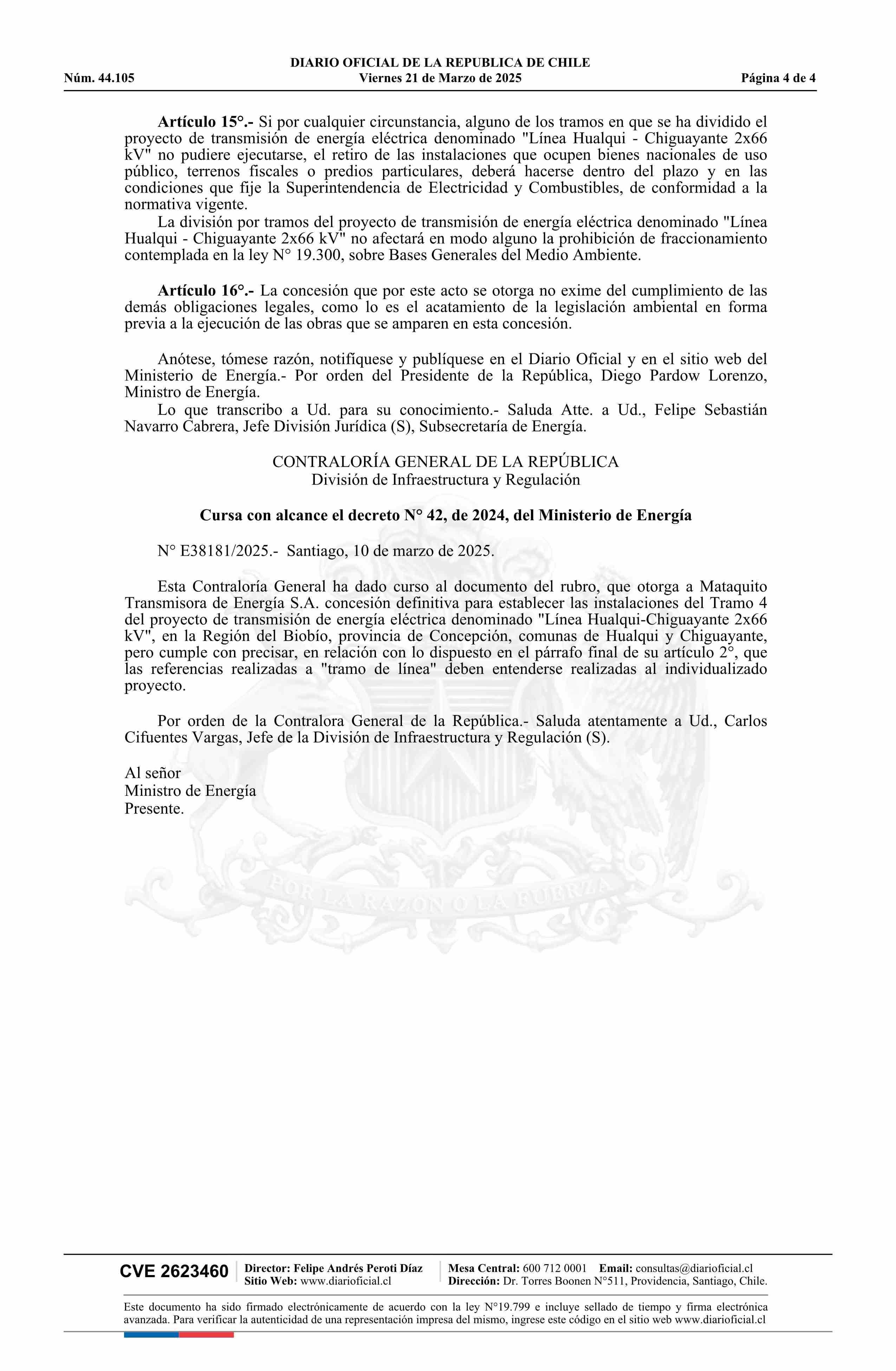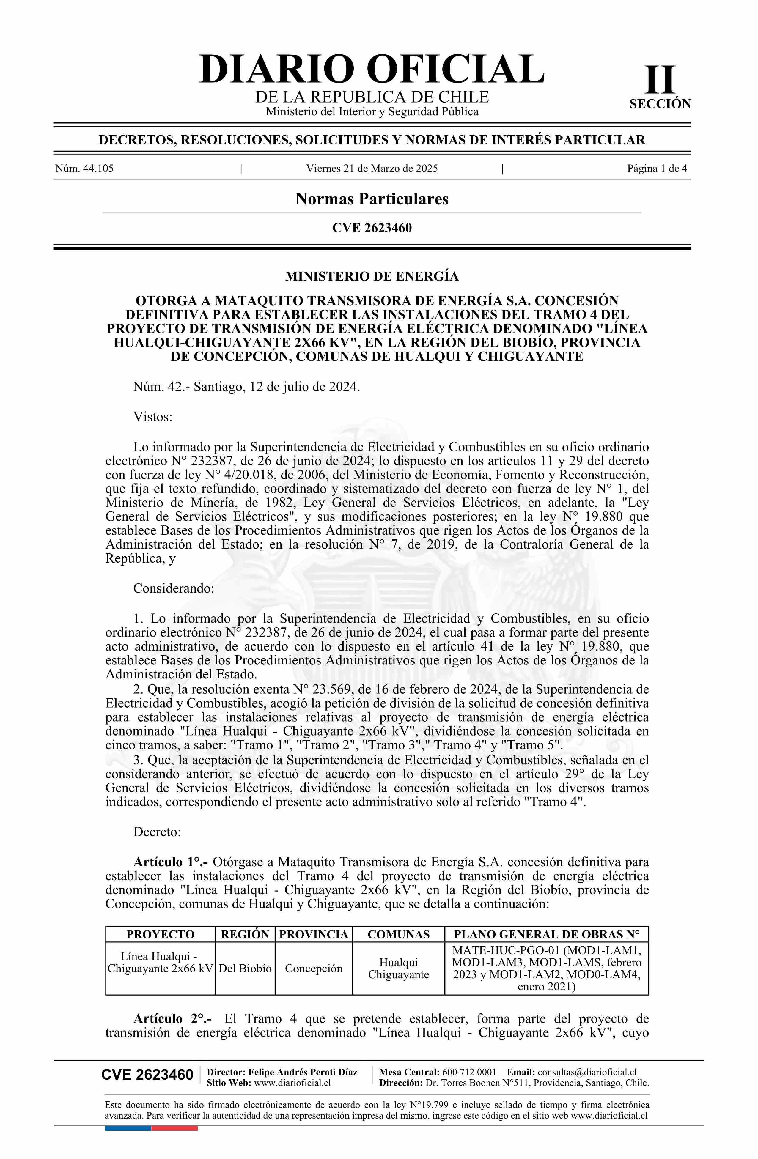 | Título: | Decreto número 42, de 2024.- Otorga a Mataquito Transmisora de Energía S.A. concesión definitiva para establecer las instalaciones del tramo 4 del proyecto de transmisión de energía eléctrica denominado Línea Hualqui-Chiguayante 2x66 kV, en la Región del Biobío, provincia de Concepción, comunas de H |