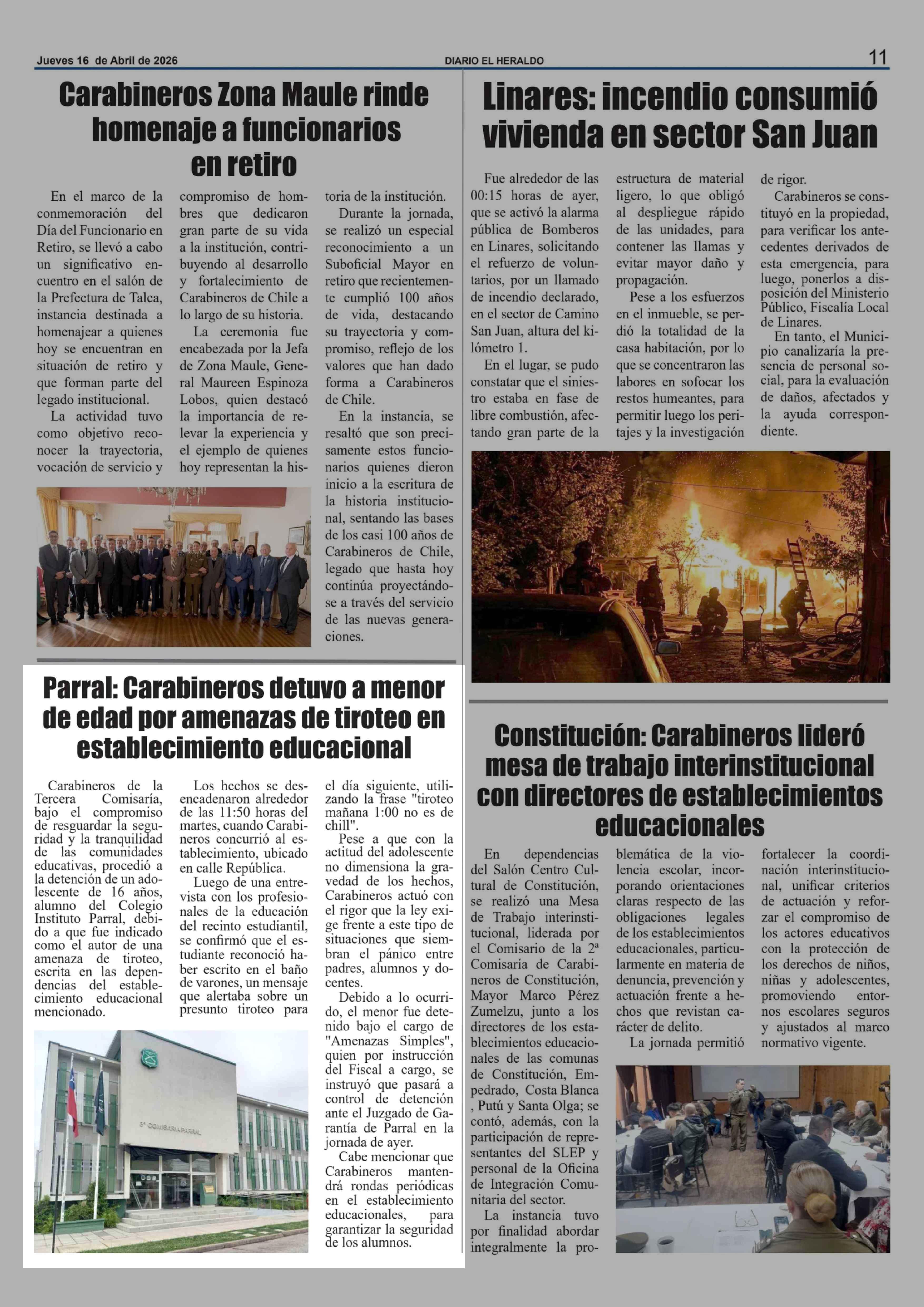 Parral: Carabineros detuvo a menor de edad por amenazas de tiroteo en establecimiento educacional 16-04-2026 El Heraldo |