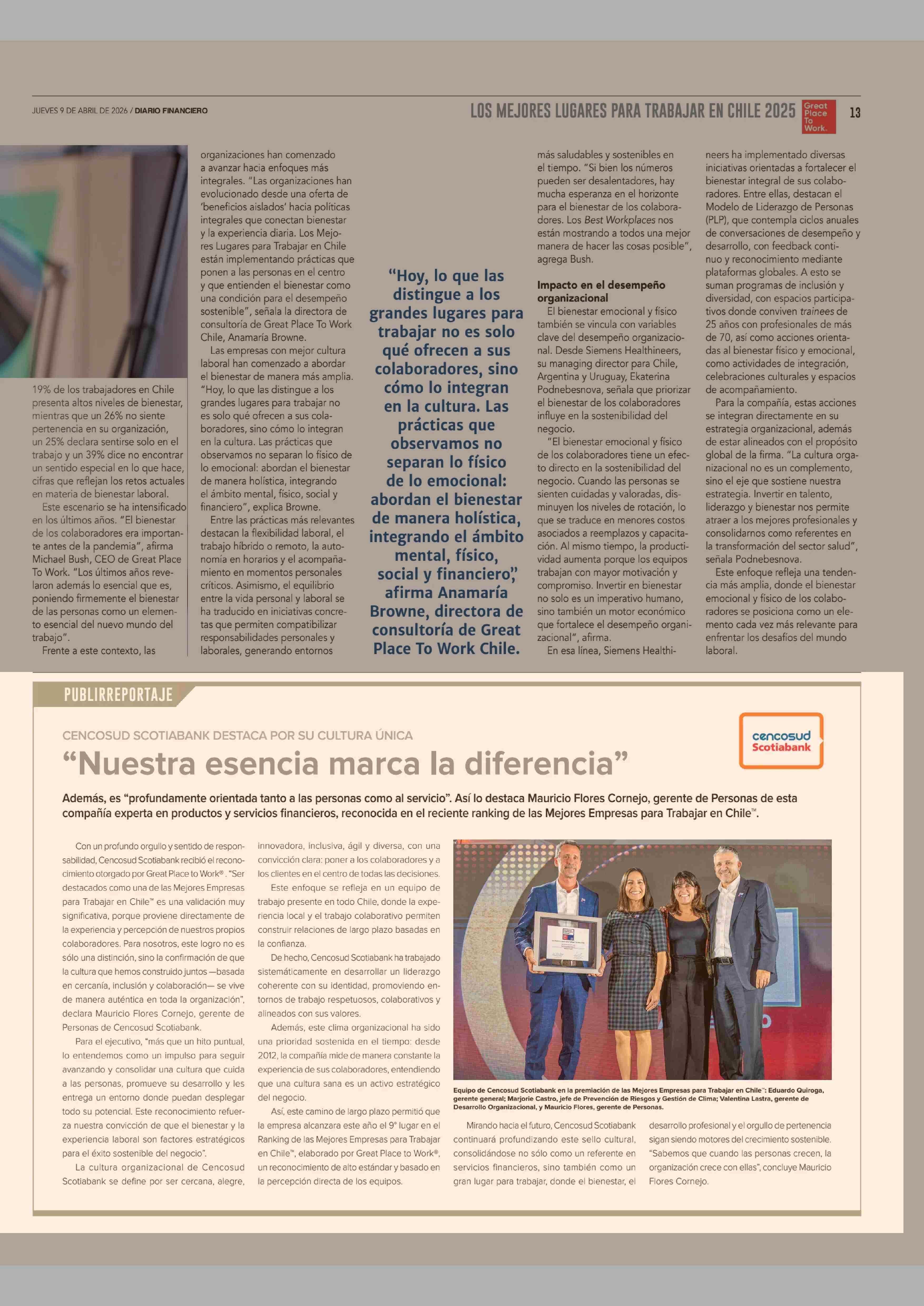 CENCOSUD SCOTIABANK DESTACA POR SU CULTURA ÚNICA “Nuestra esencia marca la diferencia” 09-04-2026 Diario Financiero |