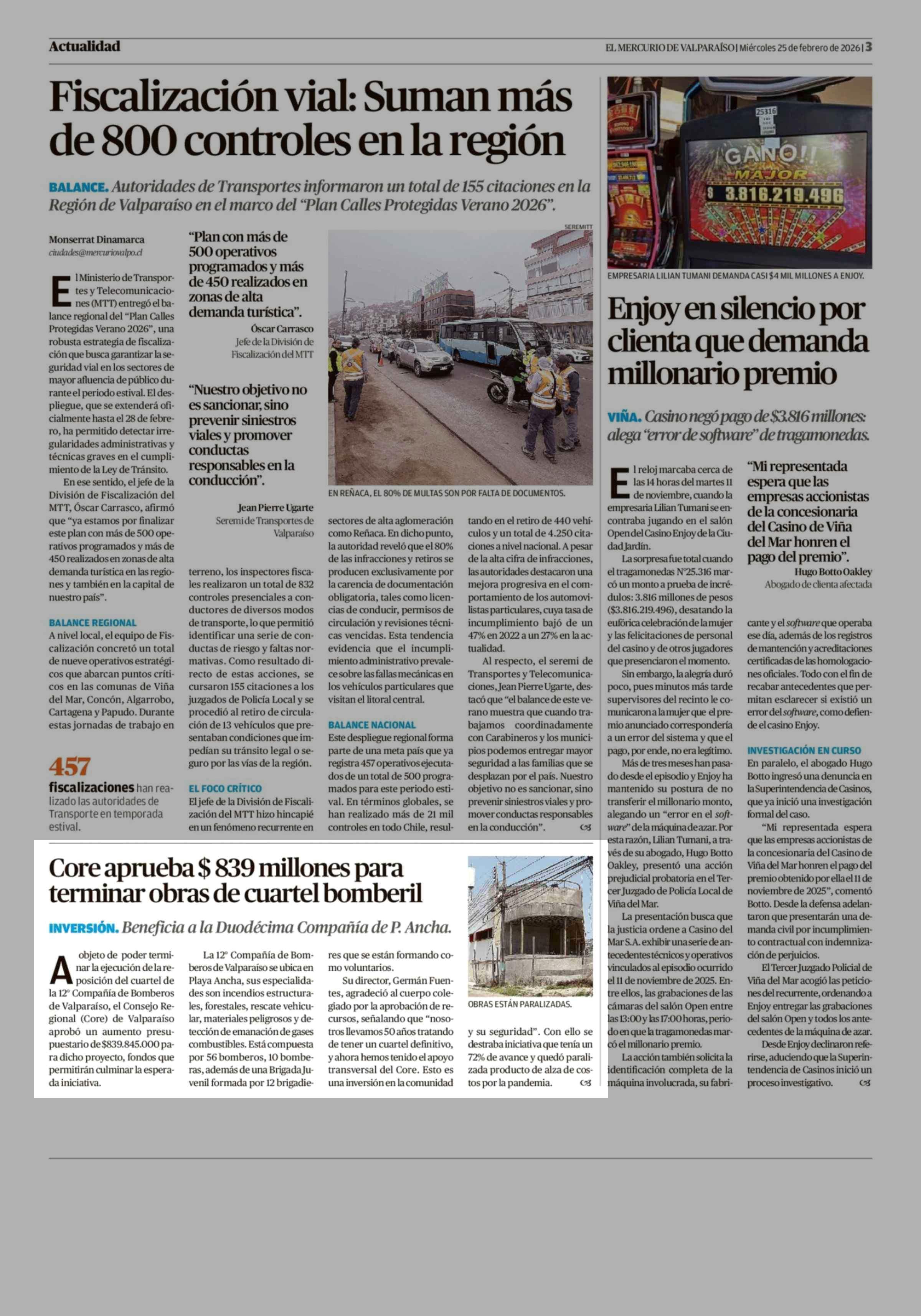 Core aprueba $ 839 millones para terminar obras de cuartel bomberil 25-02-2026 El Mercurio de Valparaíso |