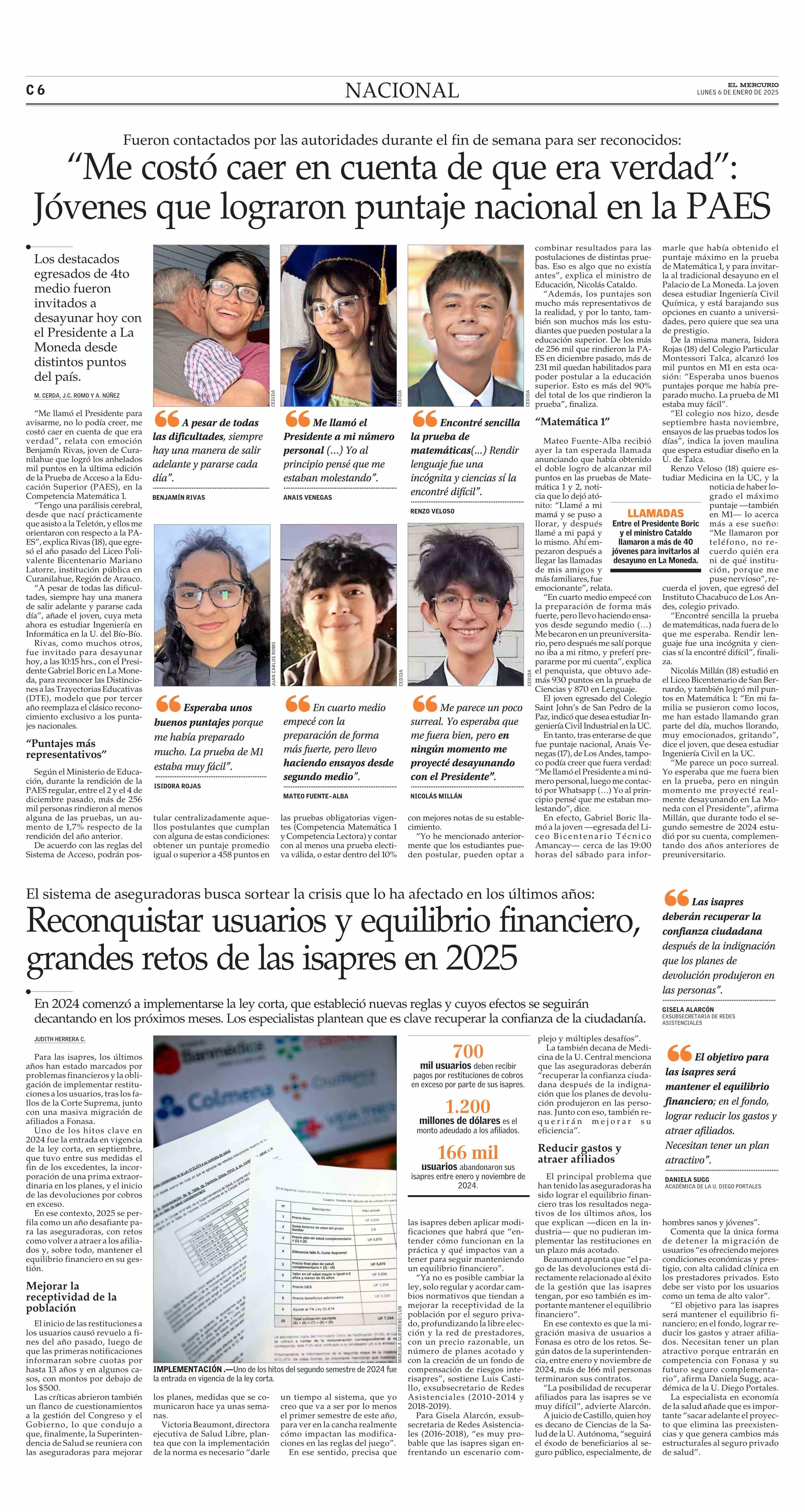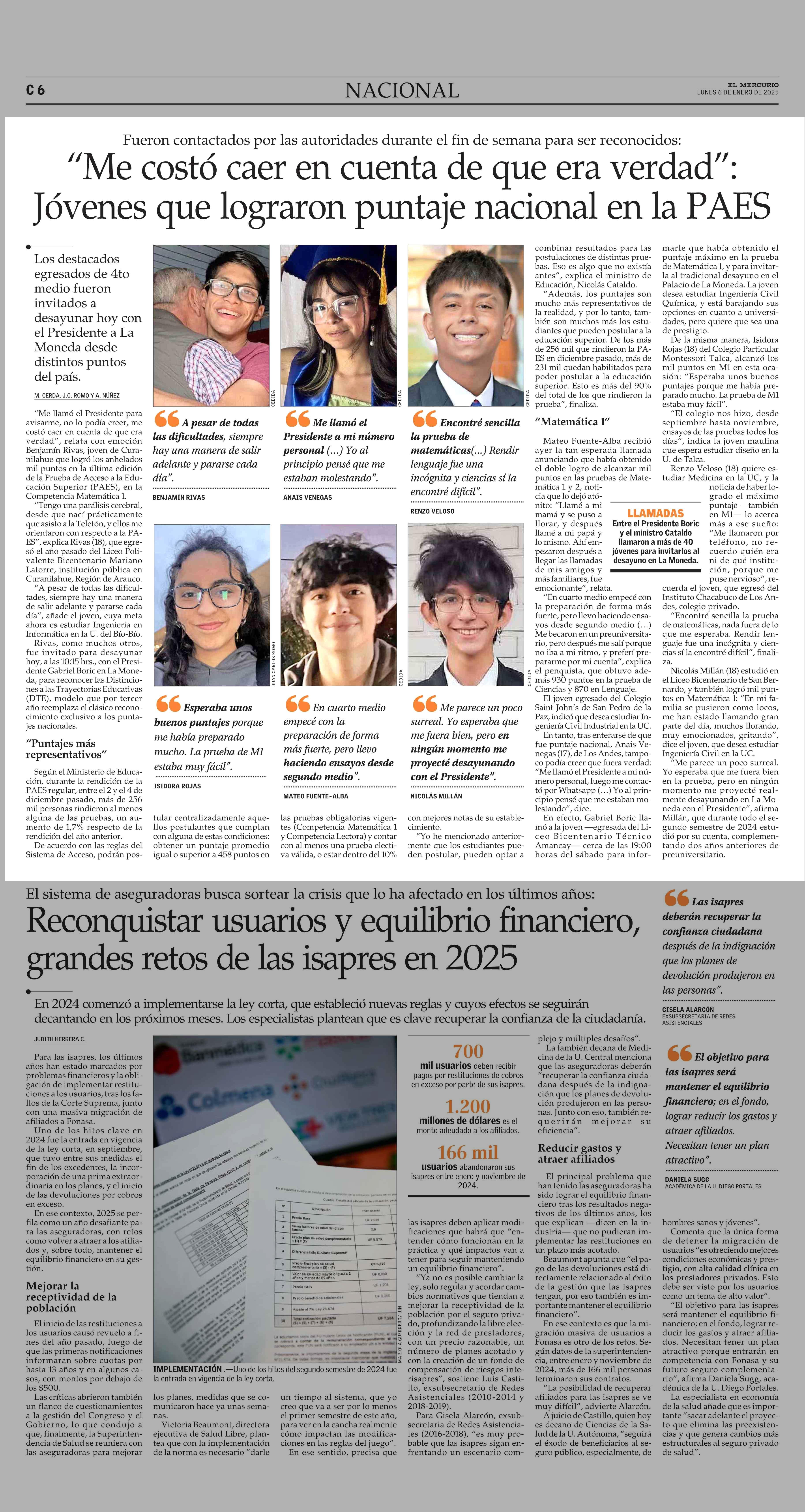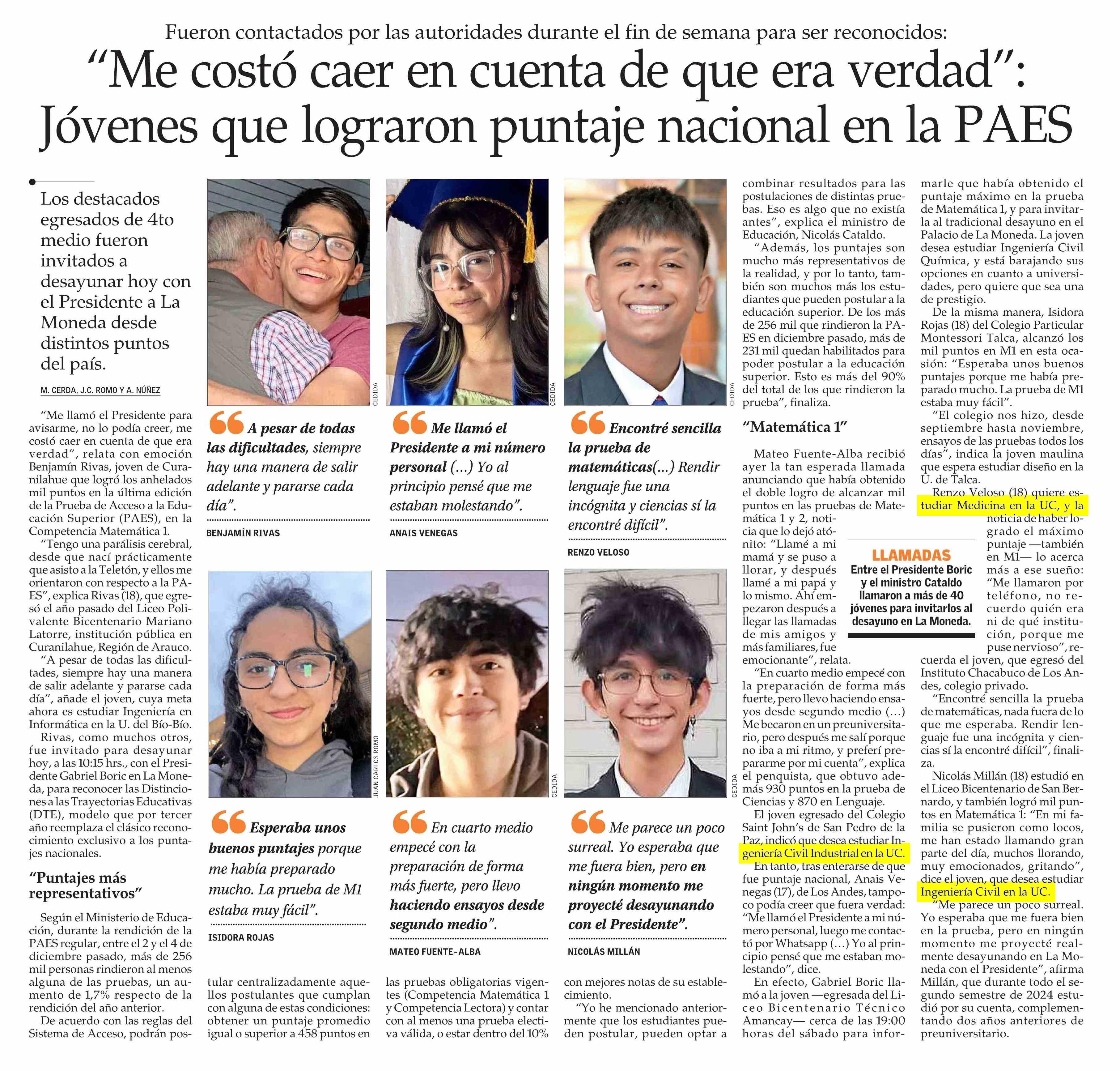 "Me costó caer en cuenta de que era verdad": Jóvenes que lograron puntaje nacional en la PAES 06-01-2025 El Mercurio |