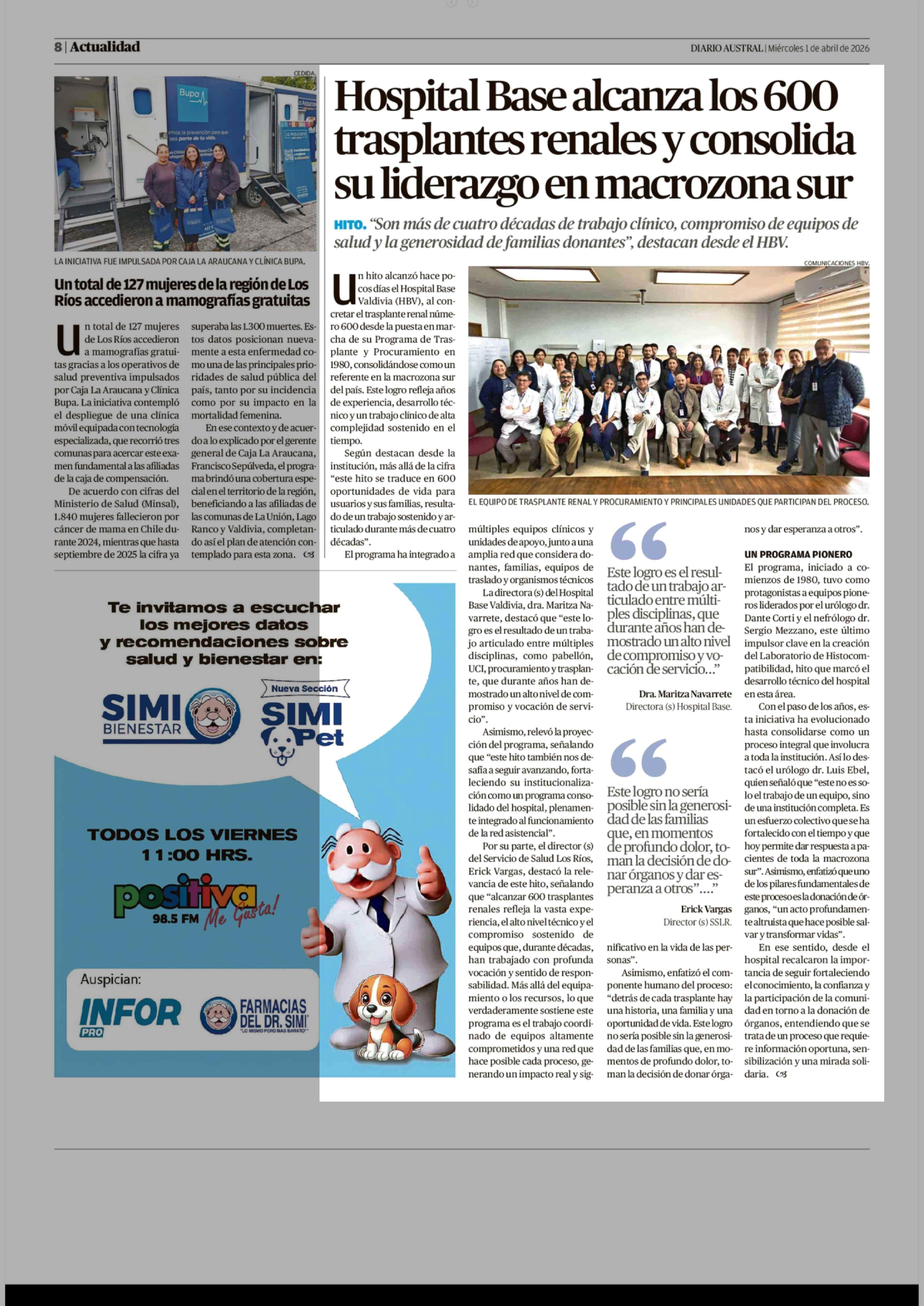 Hospital Base alcanza los 600 trasplantes renales y consolida su liderazgo en macrozona sur 01-04-2026 Diario Austral Región de Los Ríos |