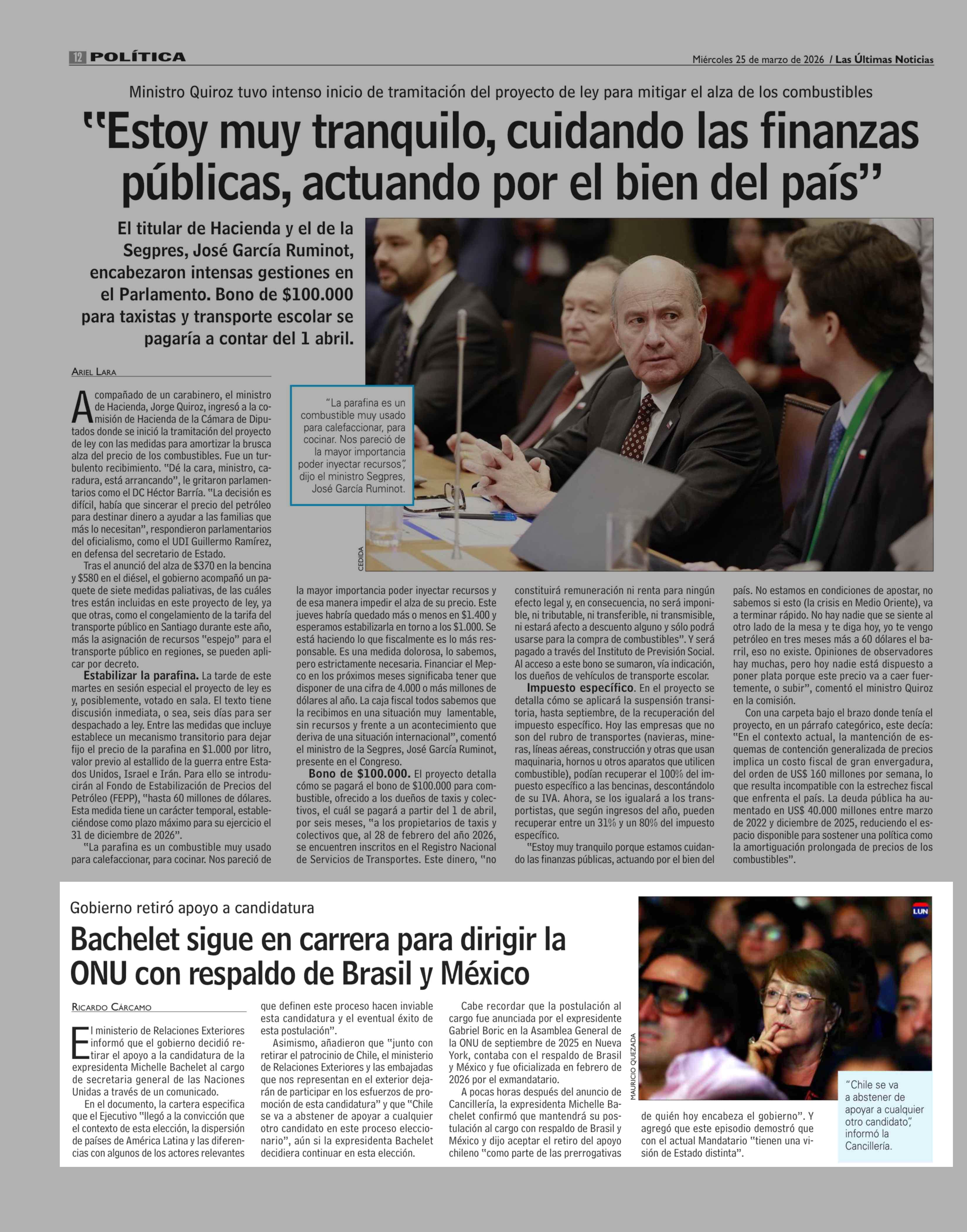 Bachelet sigue en carrera para dirigir la ONU con respaldo de Brasil y México 25-03-2026 Las Últimas Noticias |