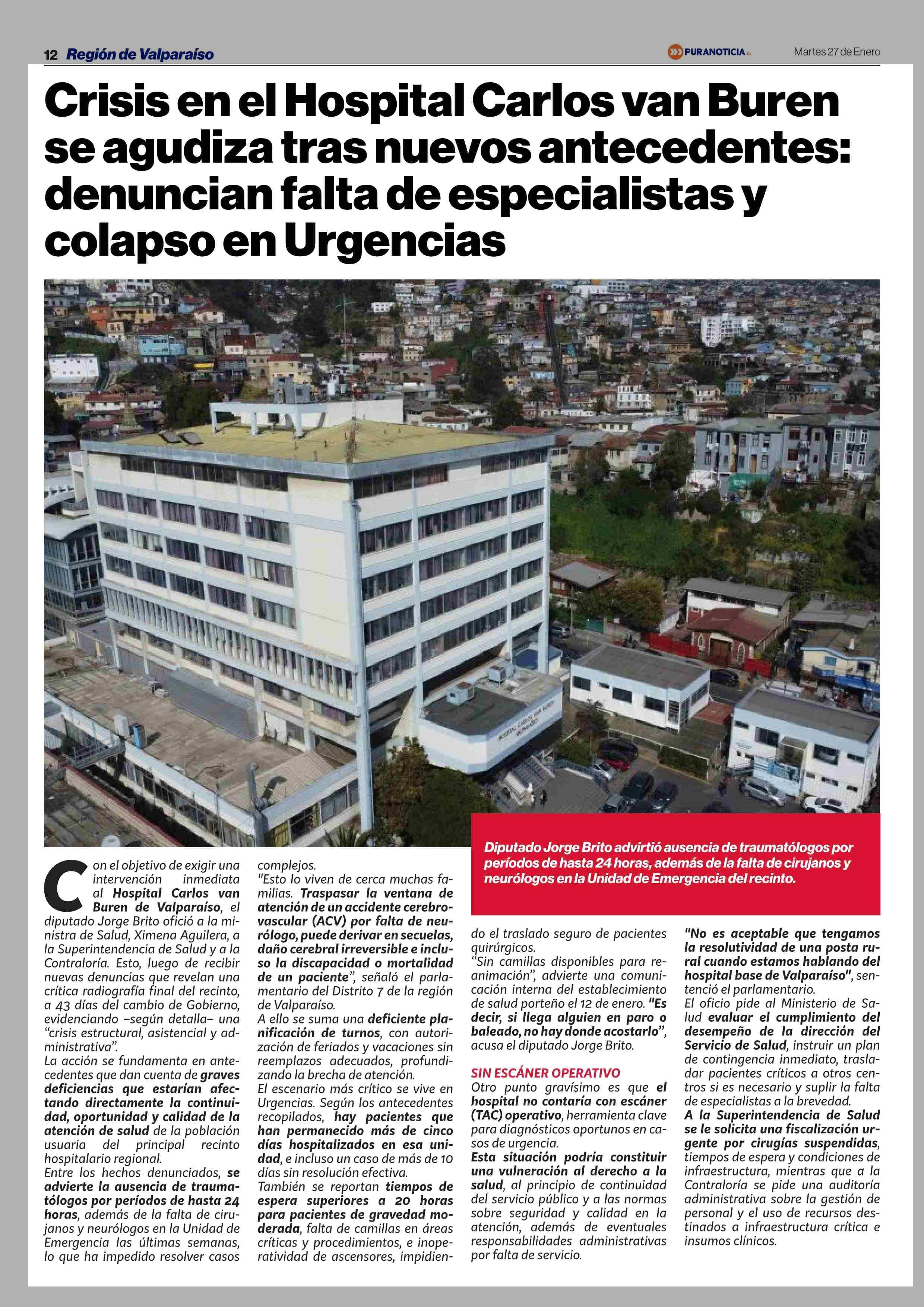 Crisis en el Hospital Carlos van Buren se agudiza tras nuevos antecedentes: denuncian falta de especialistas y colapso en Urgencias 27-01-2026 Puranoticia.cl |