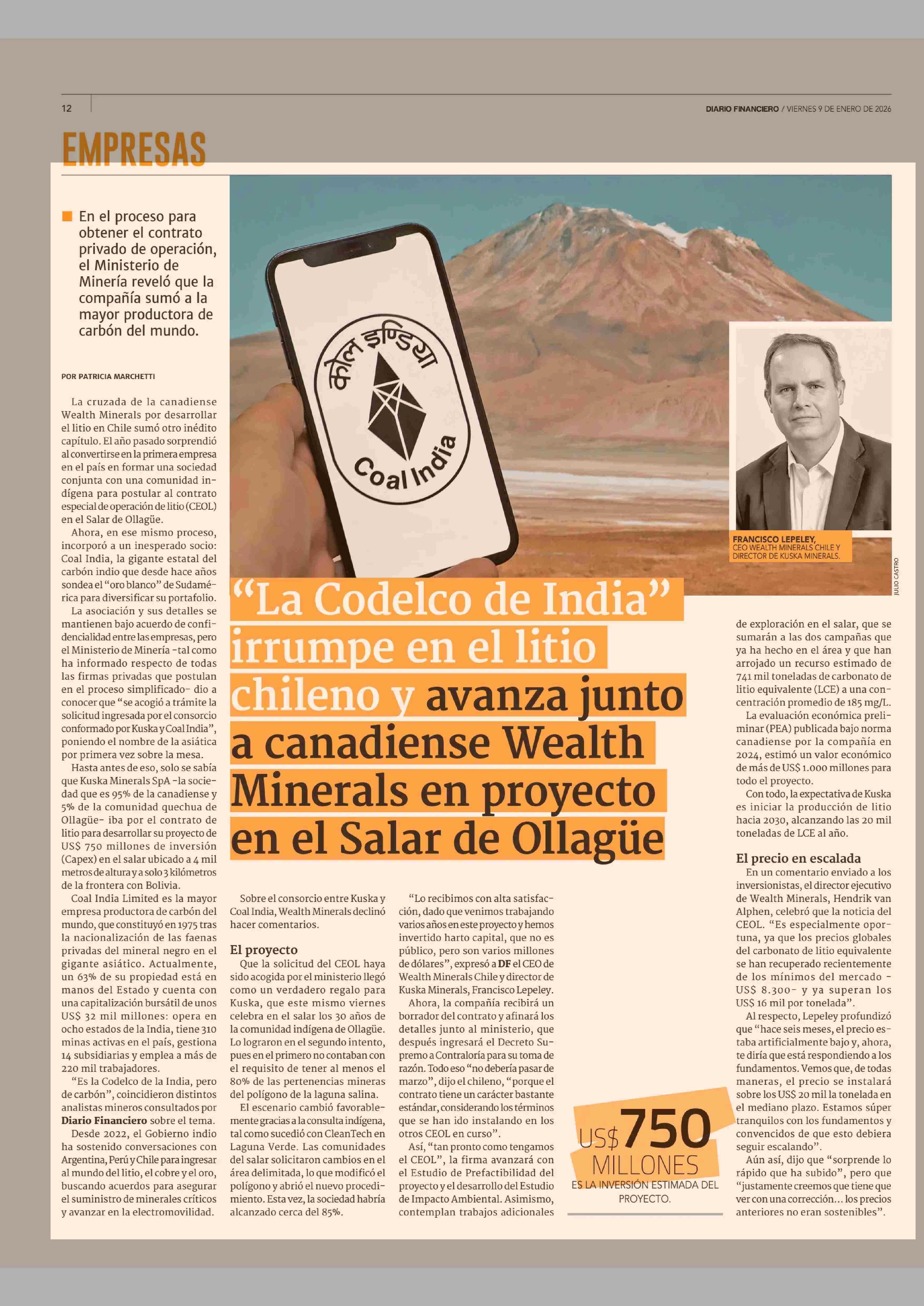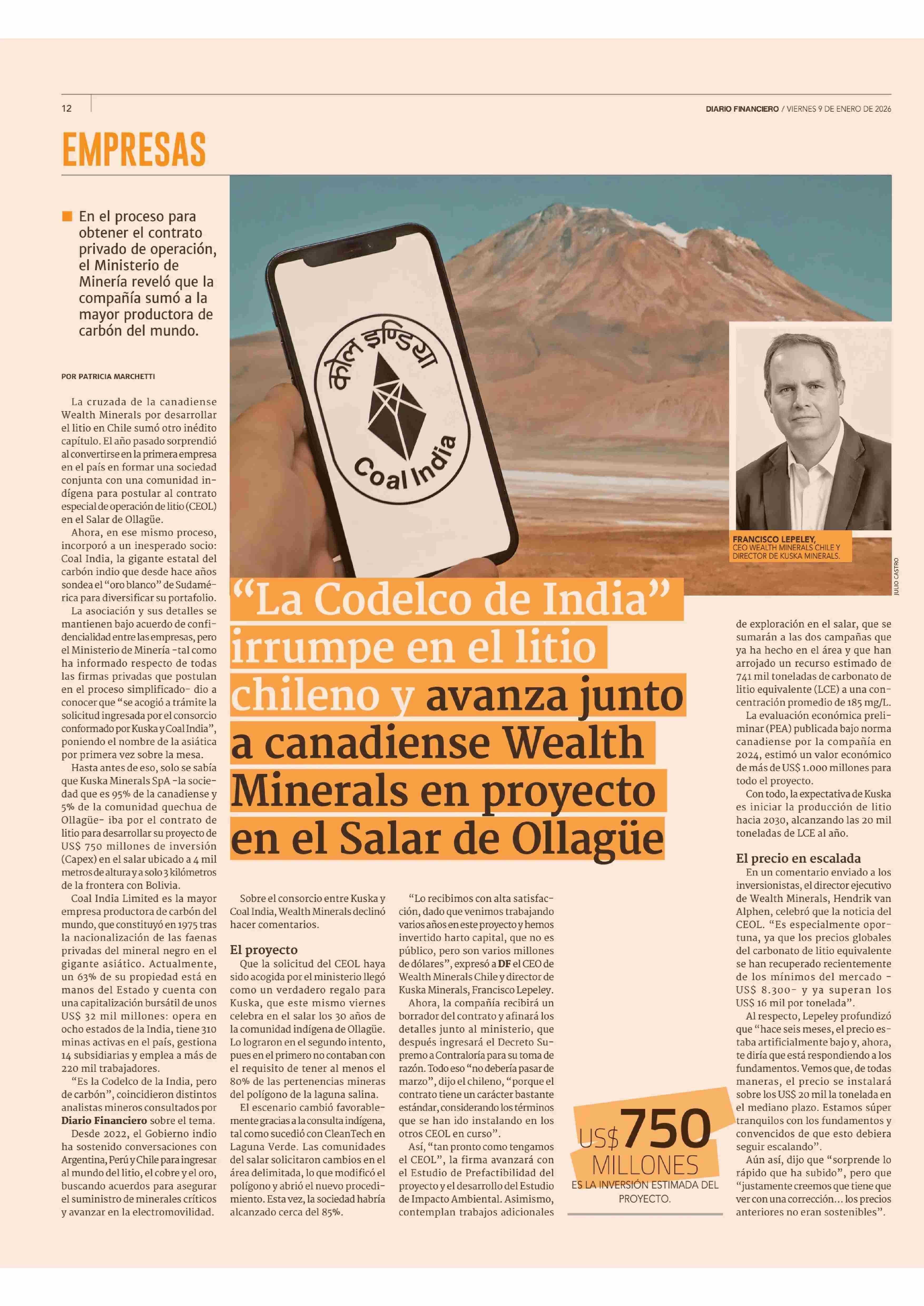 "La Codelco de India" irrumpe en el litio chileno y avanza junto a canadiense Wealth Minerals en proyecto en el Salar de Ollagüe 09-01-2026 Diario Financiero |