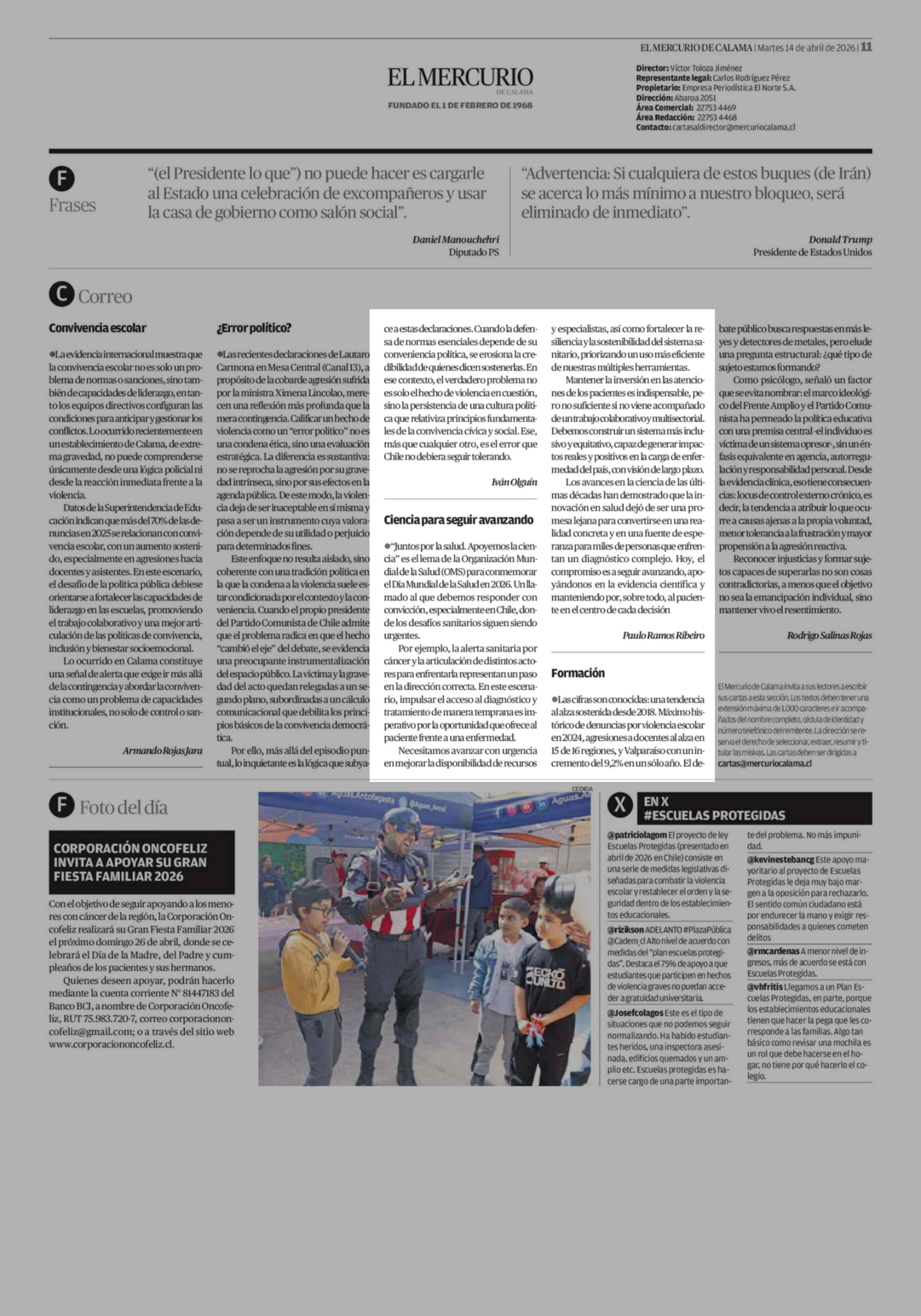 Cartas: Ciencia para seguir avanzando 14-04-2026 El Mercurio de Calama |