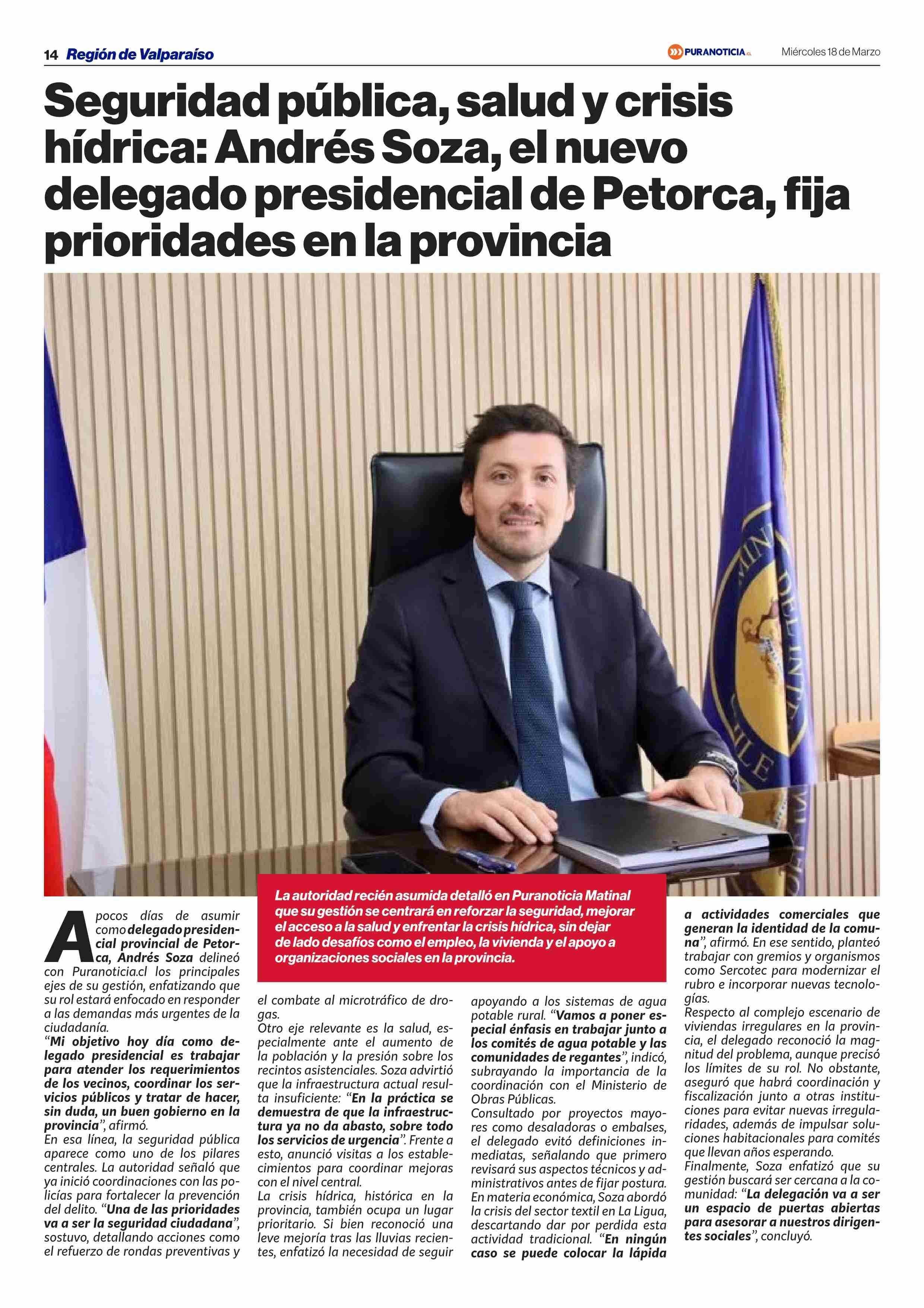 Seguridad pública, salud y crisis hídrica: Andrés Soza, el nuevo delegado presidencial de Petorca, fija prioridades en la provincia 18-03-2026 Puranoticia.cl |