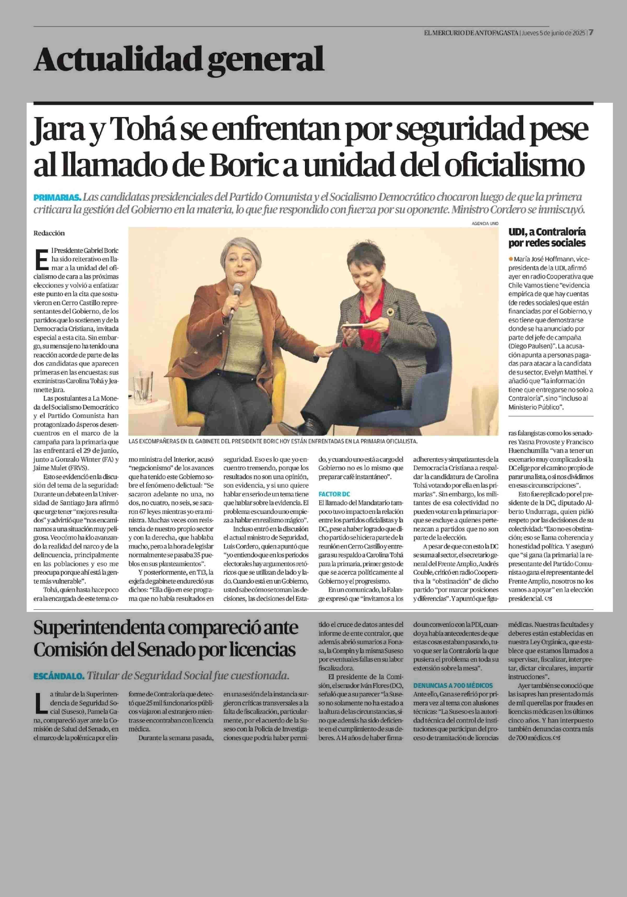 Jara y Tohá se enfrentan por seguridad pese al llamado de Boric a unidad del oficialismo 05-06-2025 El Mercurio de Antofagasta |