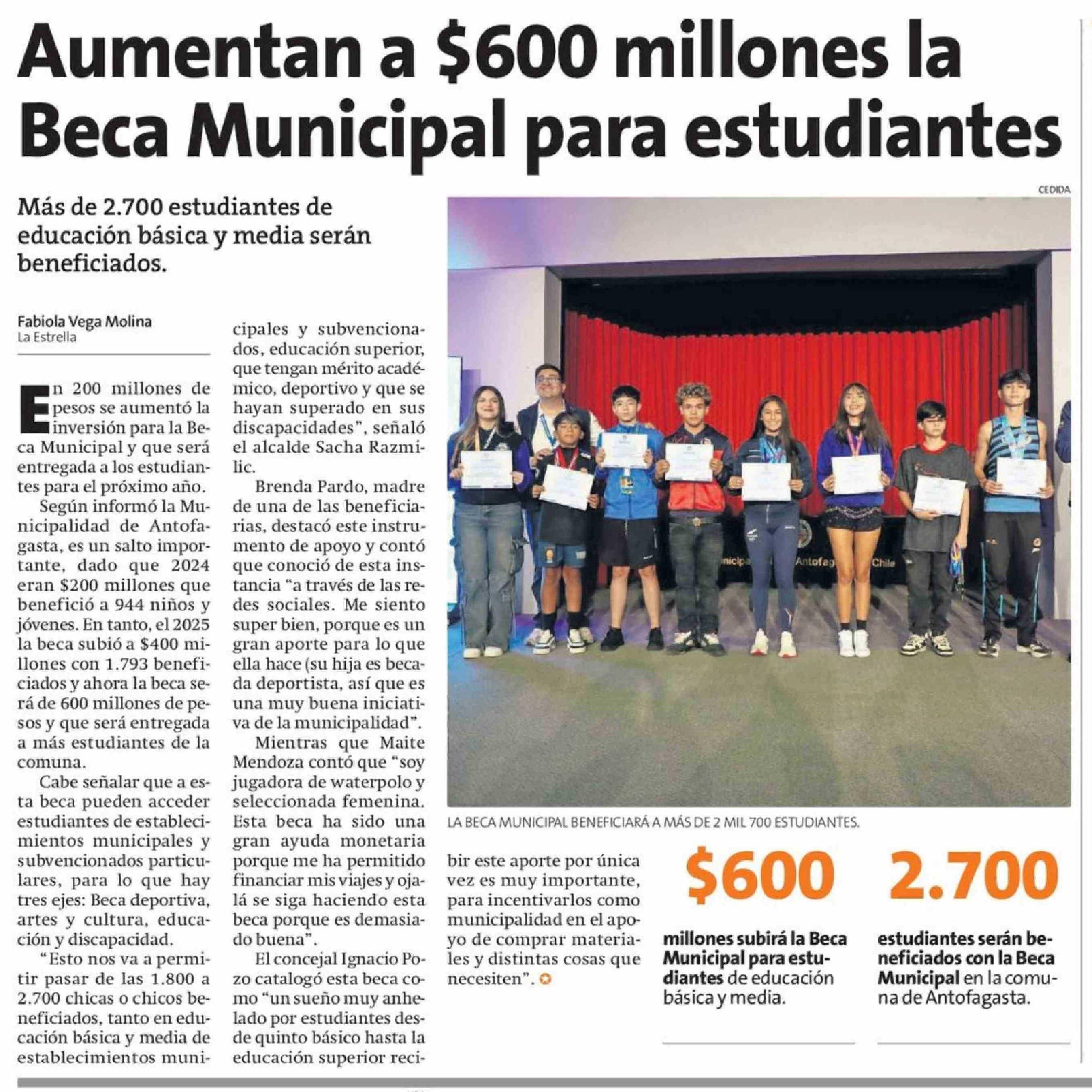 Aumentan a $600 millones la Beca Municipal para estudiantes 24-04-2026 La Estrella de Antofagasta |