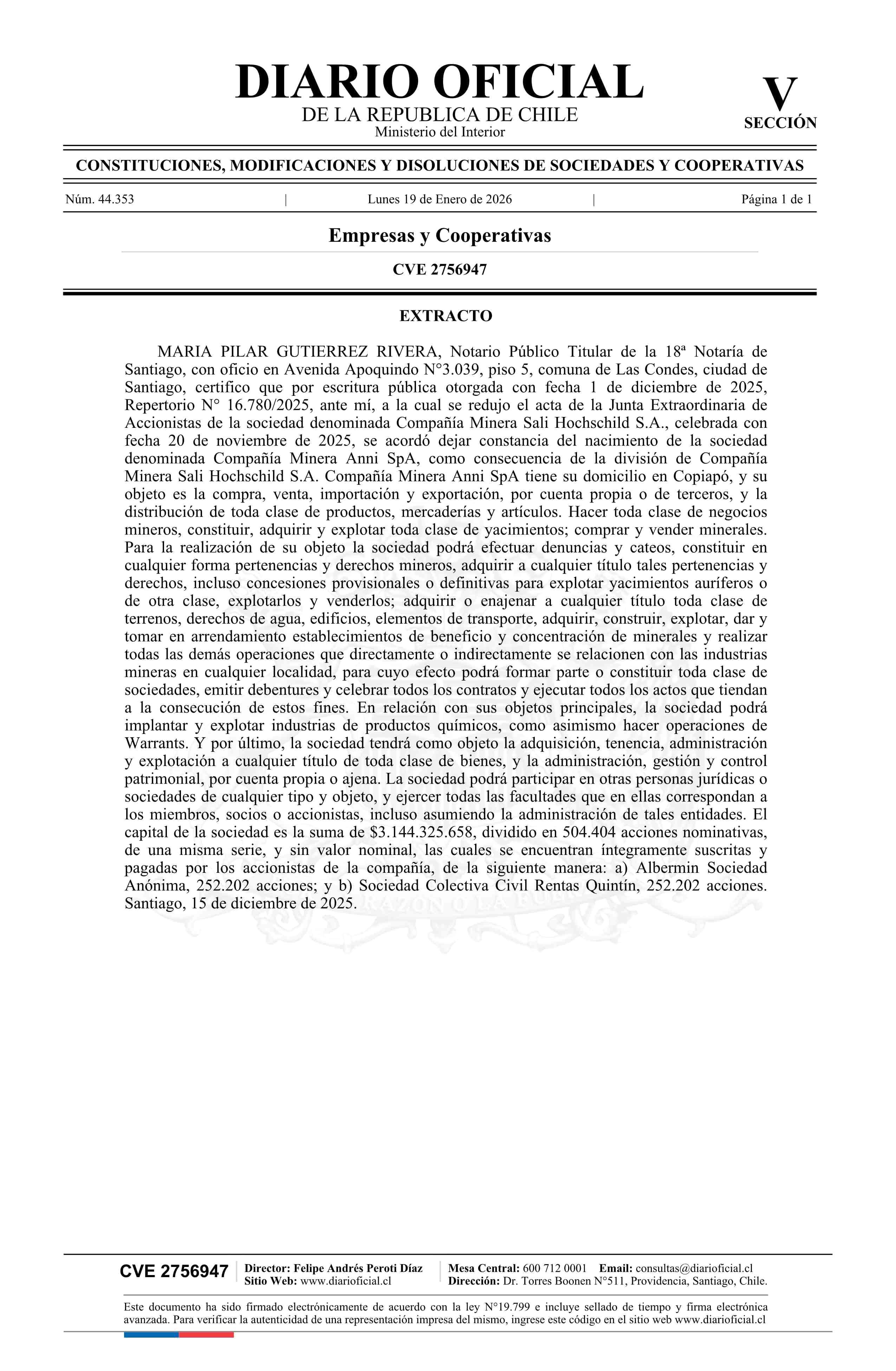 Compañía Minera Anni SpA 19-01-2026 Diario Oficial Edición Electrónica |