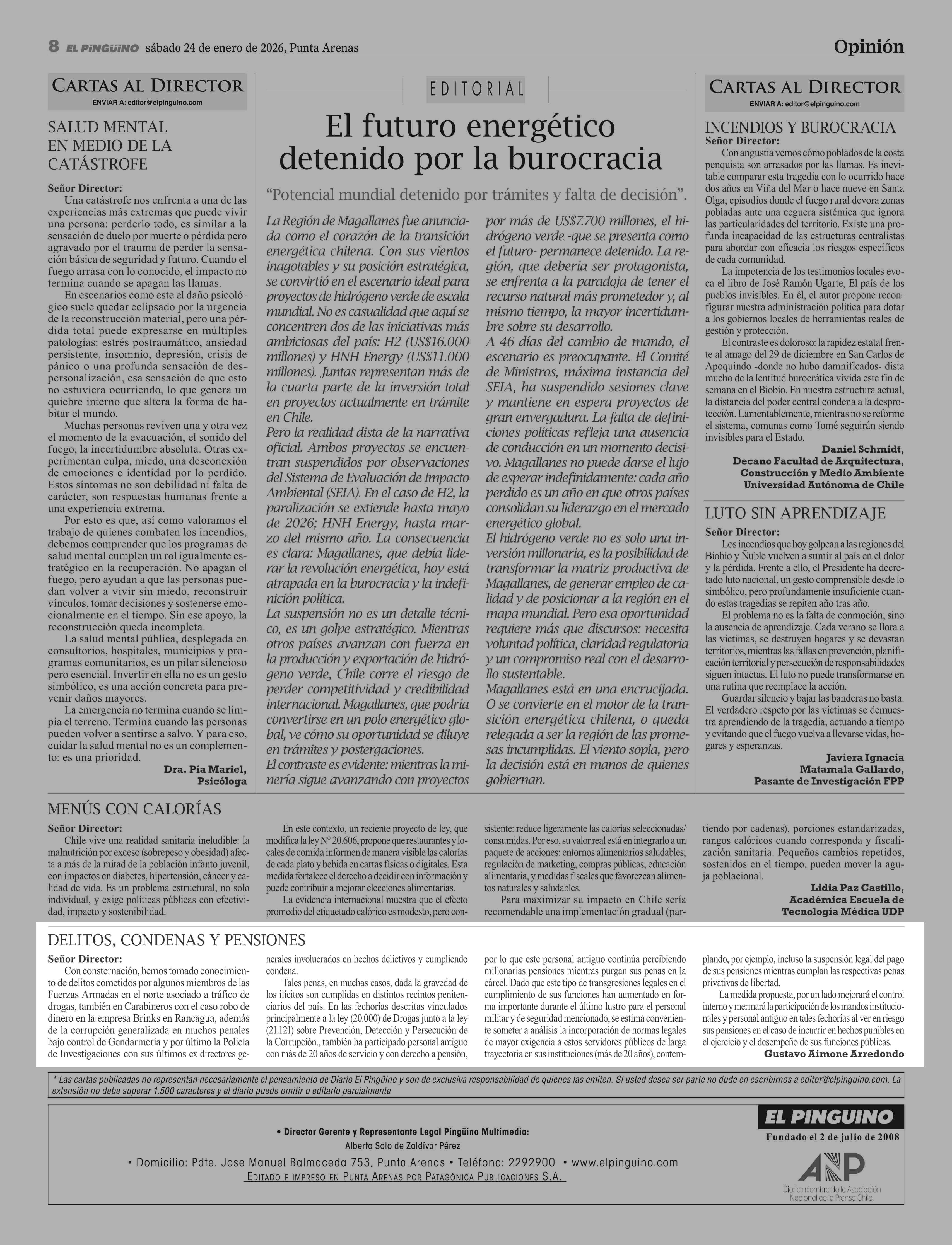 Cartas: DELITOS, CONDENAS Y PENSIONES 24-01-2026 El Pingüino |