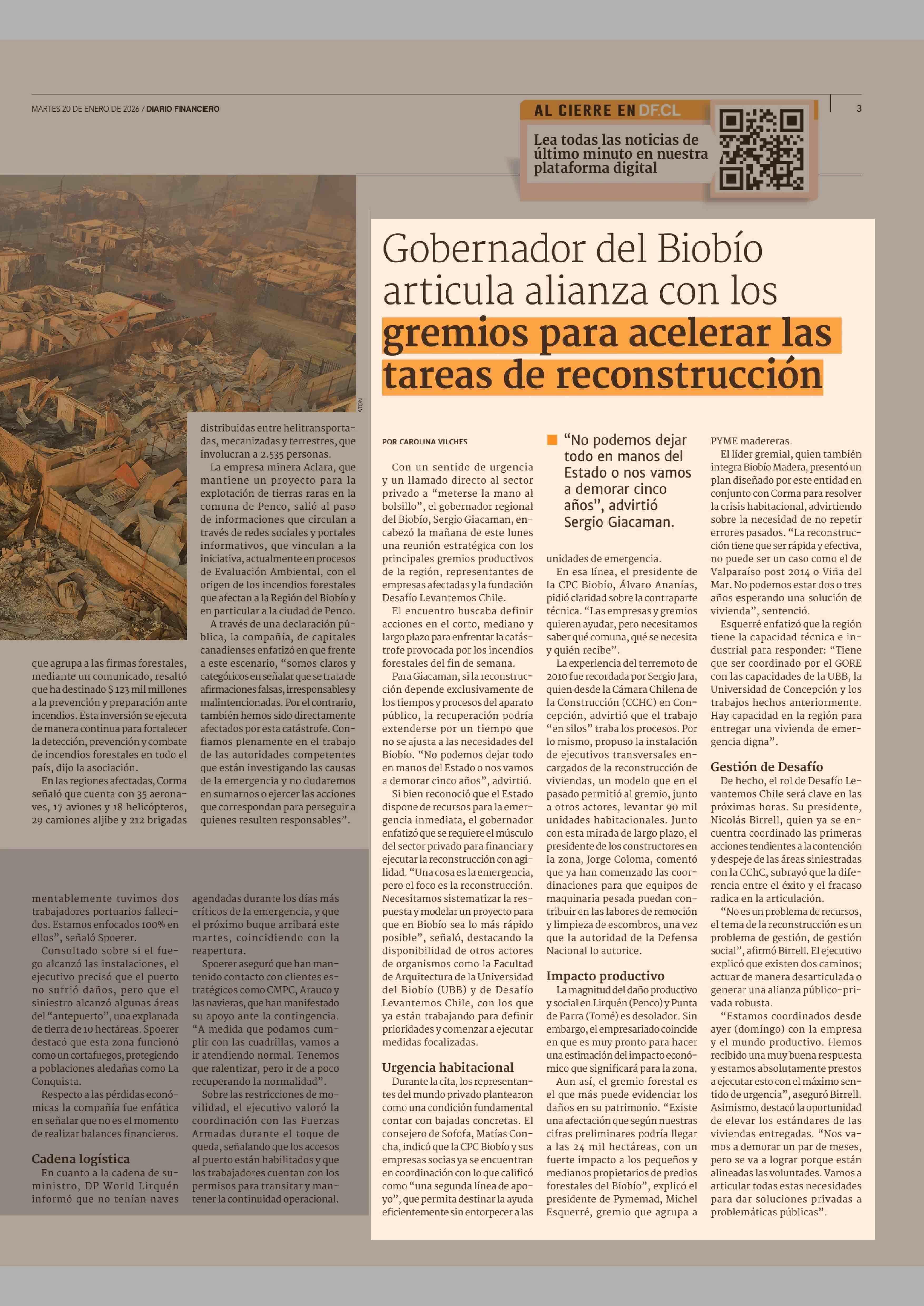 Gobernador del Biobío articula alianza con los gremios para acelerar las tareas de reconstrucción 20-01-2026 Diario Financiero |