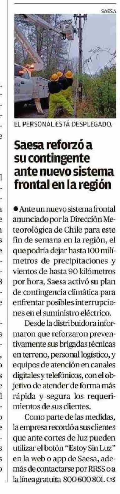 | Título: | EL PERSONAL ESTÁ DESPLEGADO. Saesa reforzó a su contingente ante nuevo sistema frontal en la región Ante un nuevosistema frontal anunciado porla Dirección Meteorológica de Chile para este fin de semana en la región, el quepodría dejar hasta 100 milímetros de precipitaciones y vientos de hasta 90 kil |