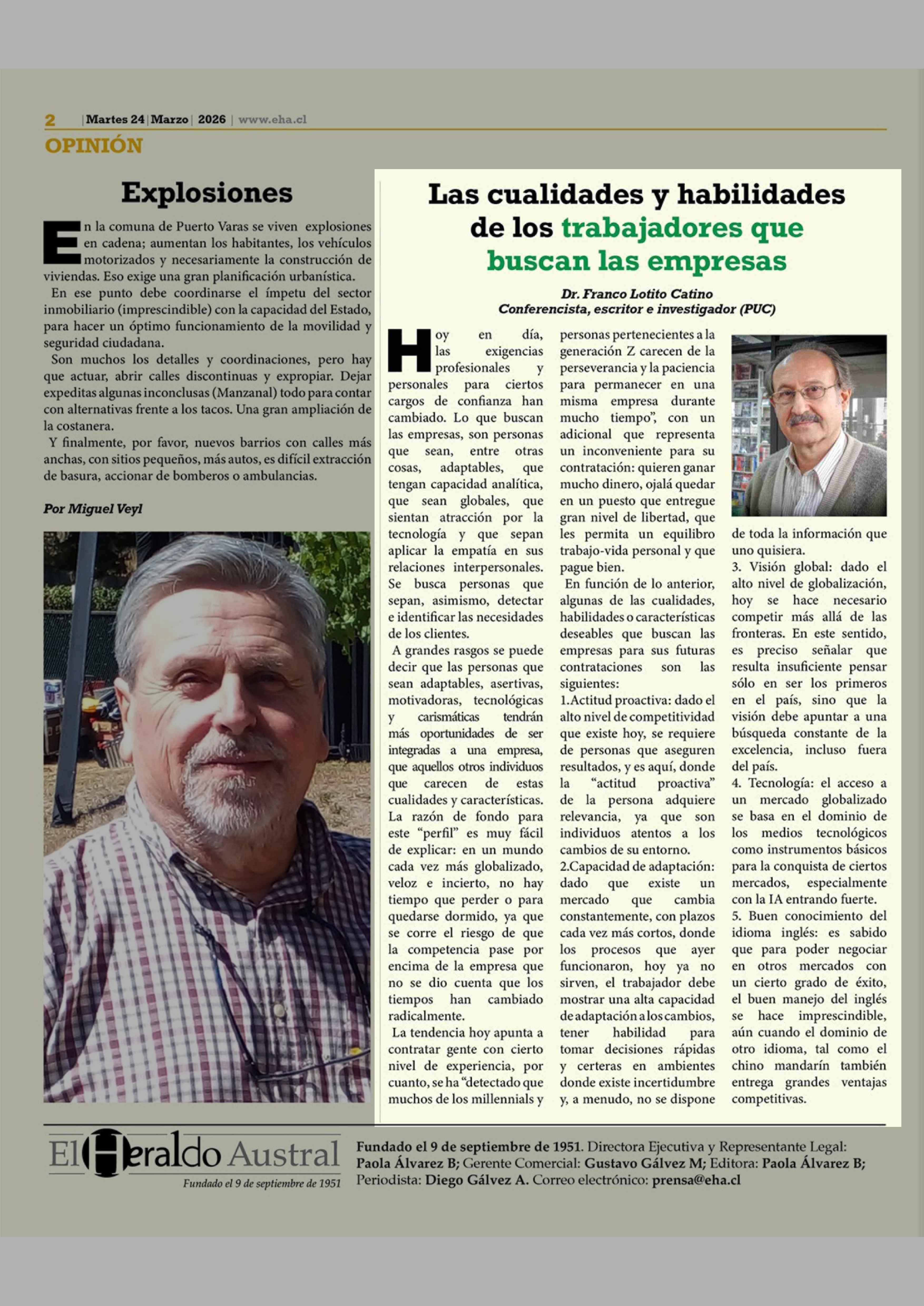 Columnas de Opinión: Las cualidades y habilidades de los trabajadores que buscan las empresas 24-03-2026 El Heraldo Austral |