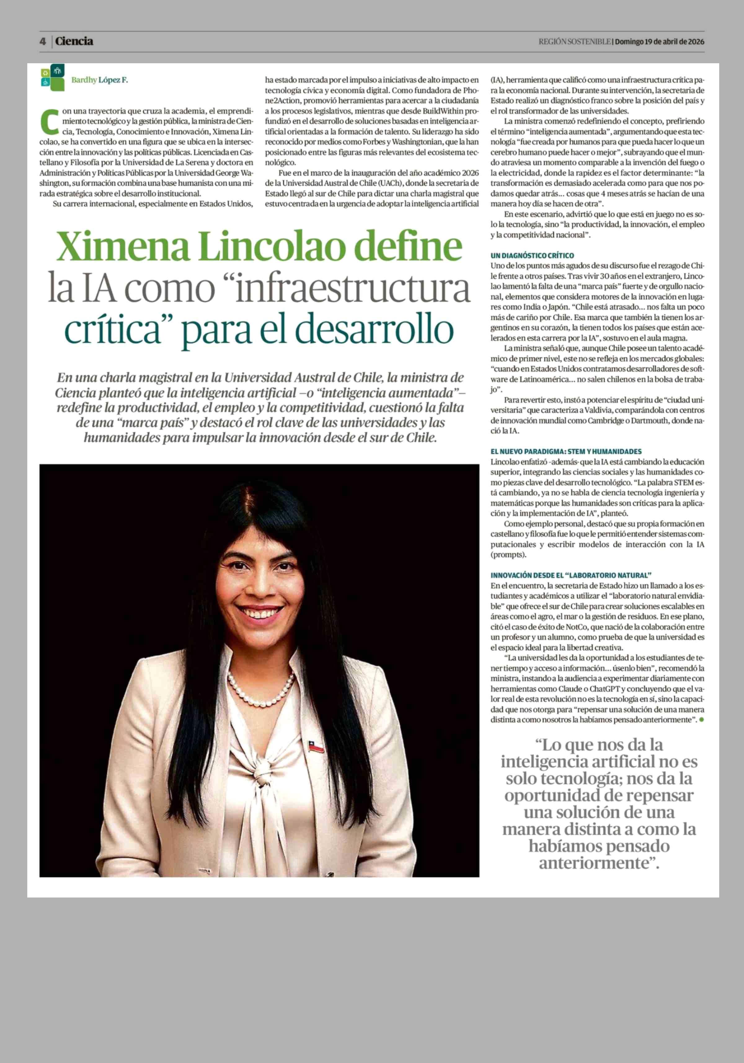 Ximena Lincolao define la IA como "infraestructura crítica" para el desarrollo 19-04-2026 El Llanquihue |