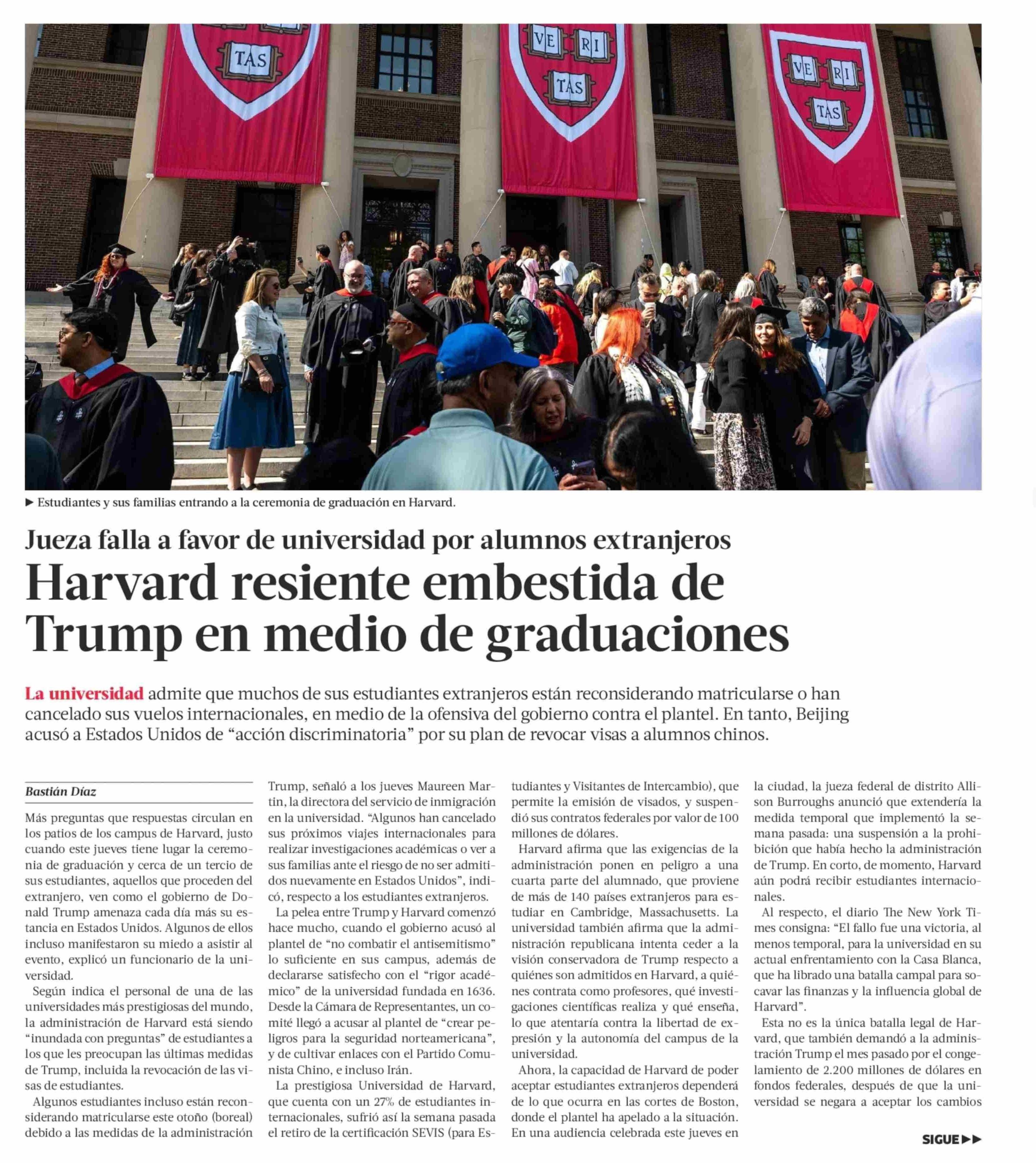 Harvard resiente embestida de Trump en medio de graduaciones 30-05-2025 La Tercera |