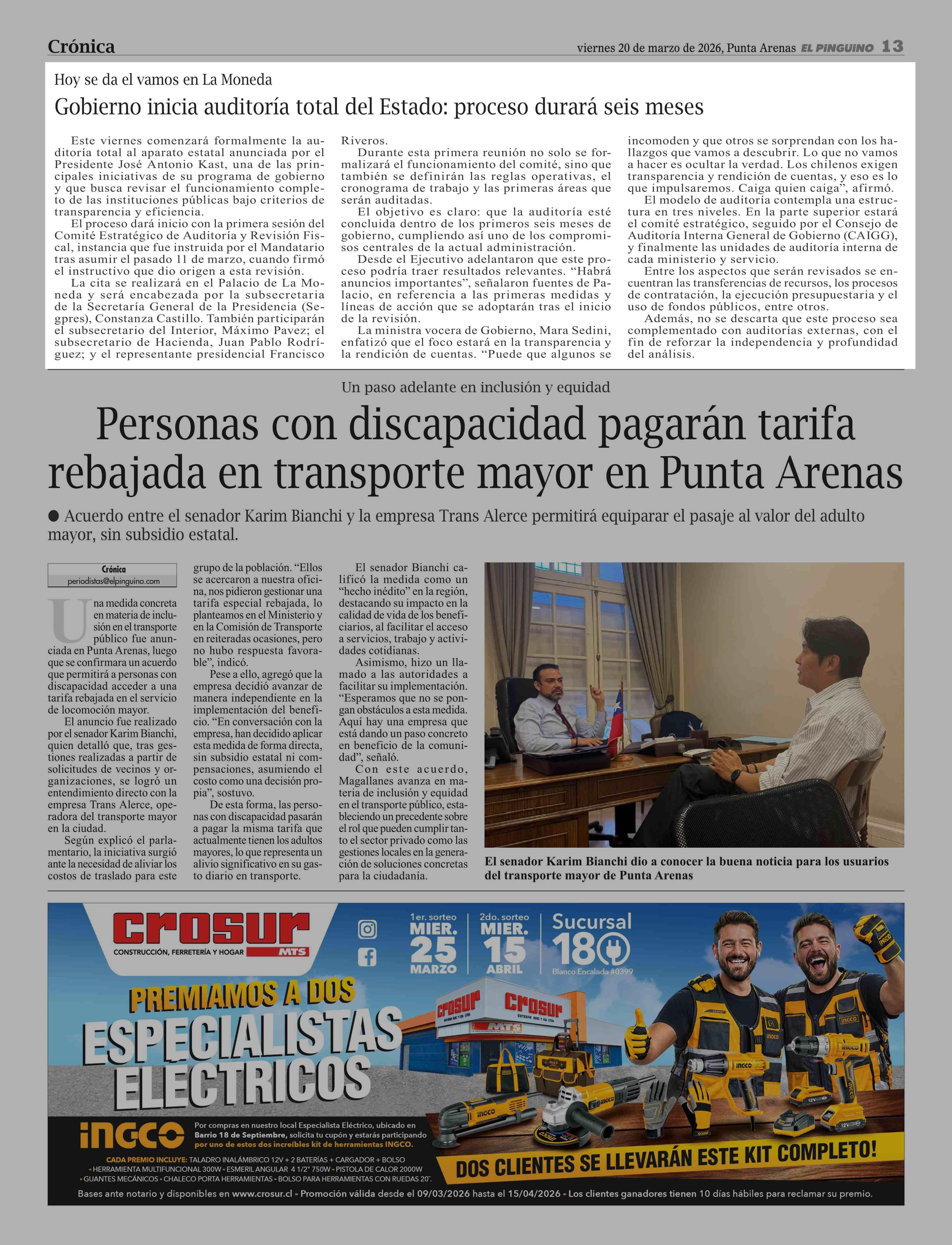 Gobierno inicia auditoría total del Estado: proceso durará seis meses 20-03-2026 El Pingüino |