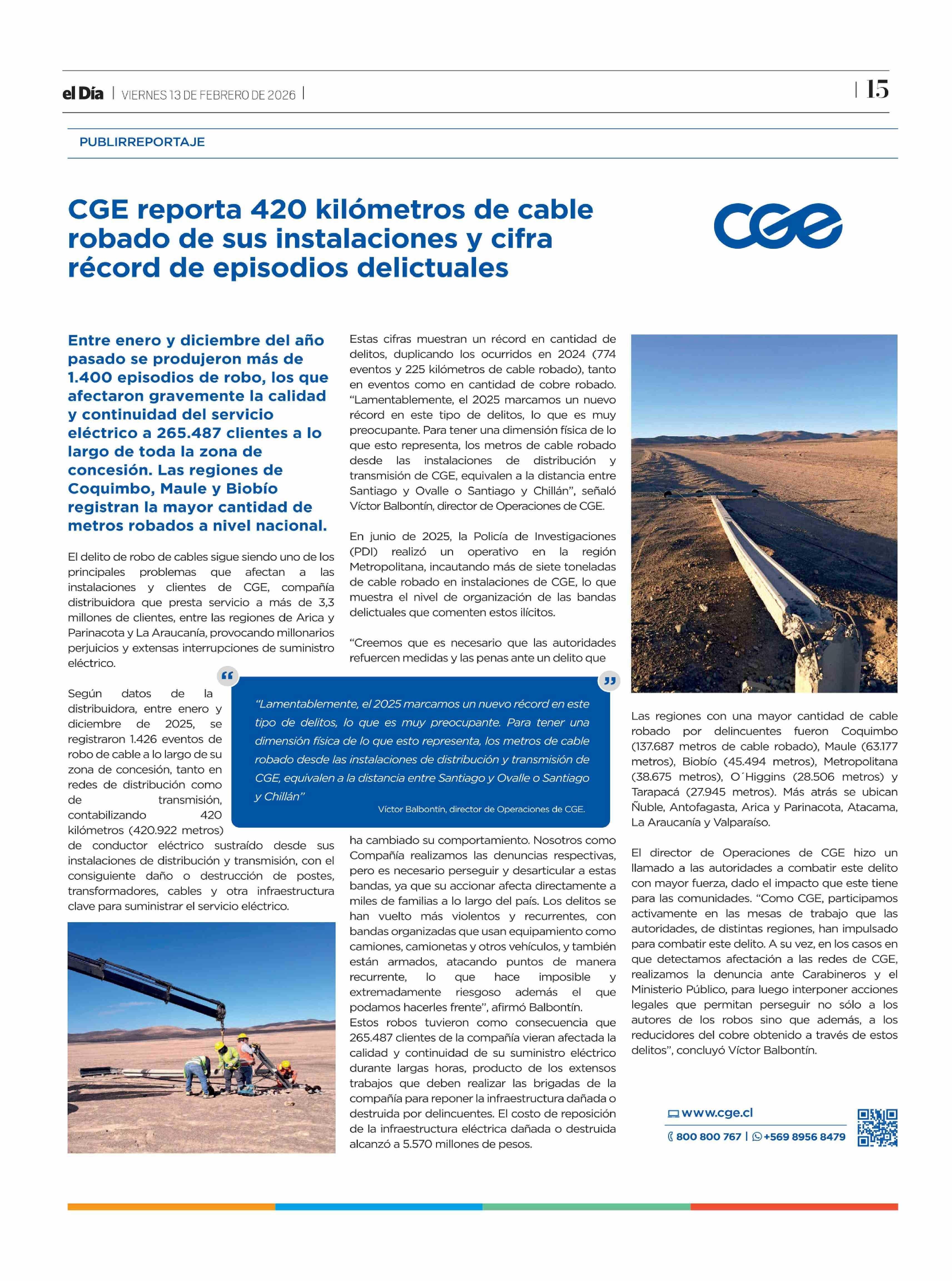 CGE reporta 420 kilómetros de cable robado de sus instalaciones y cifra récord de episodios delictuales 13-02-2026 El Día |