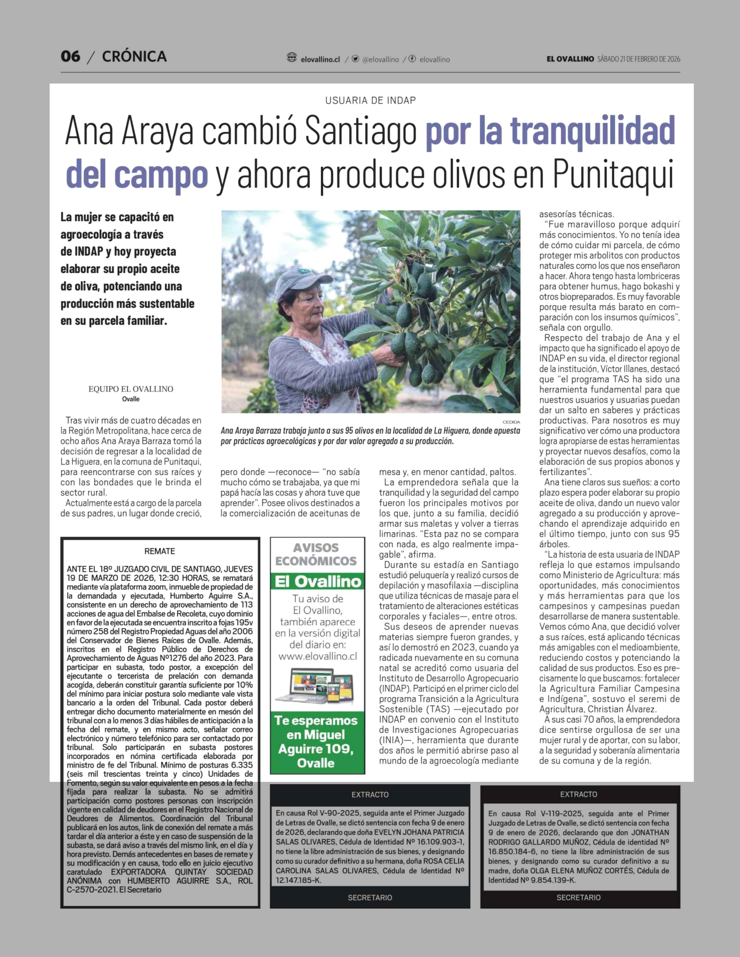 Ana Araya cambió Santiago por la tranquilidad del campo y ahora produce olivos en Punitaqui 21-02-2026 El Ovallino |