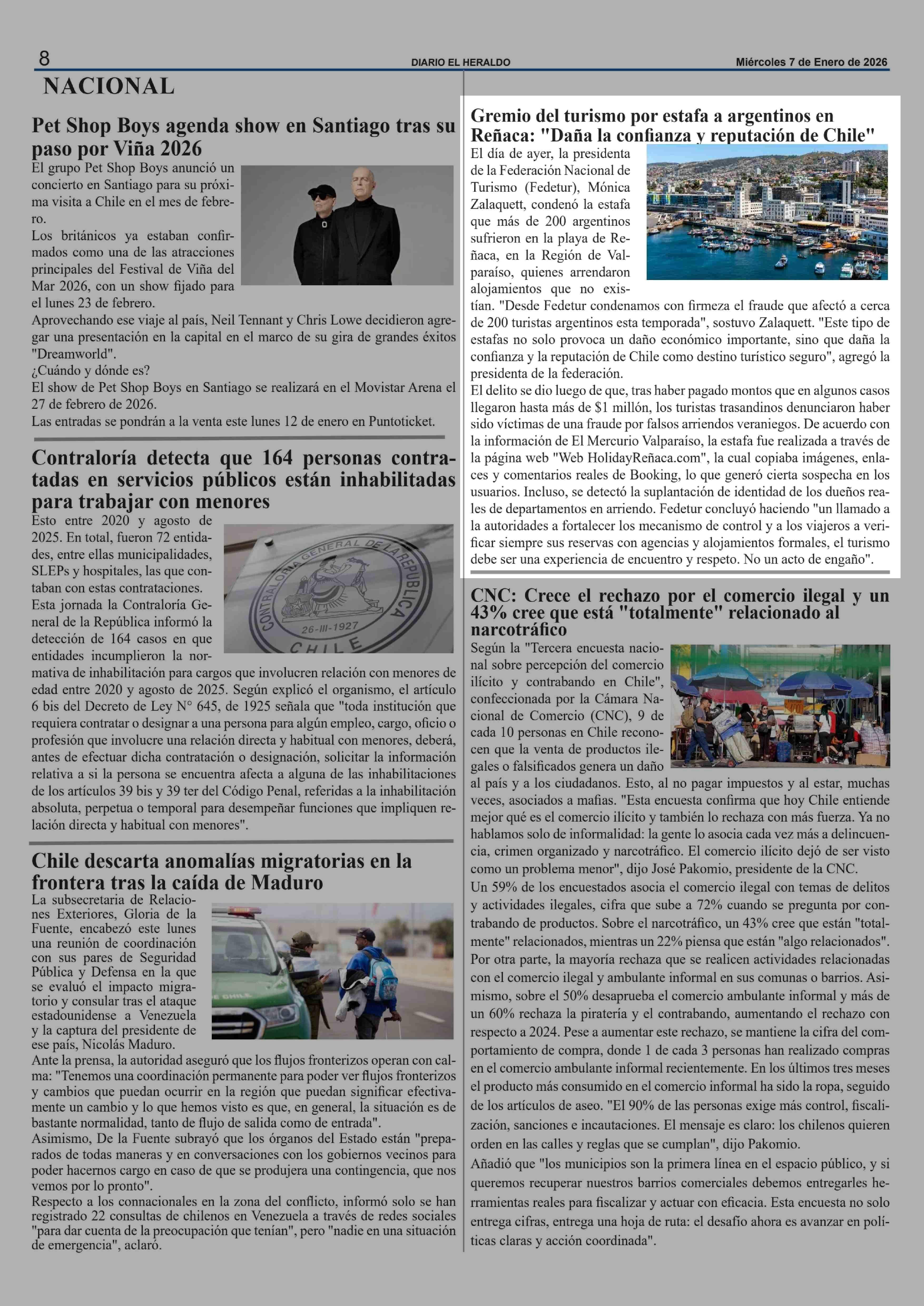 Gremio del turismo por estafa a argentinos en Reñaca: "Daña la confianza y reputación de Chile" 07-01-2026 El Heraldo |