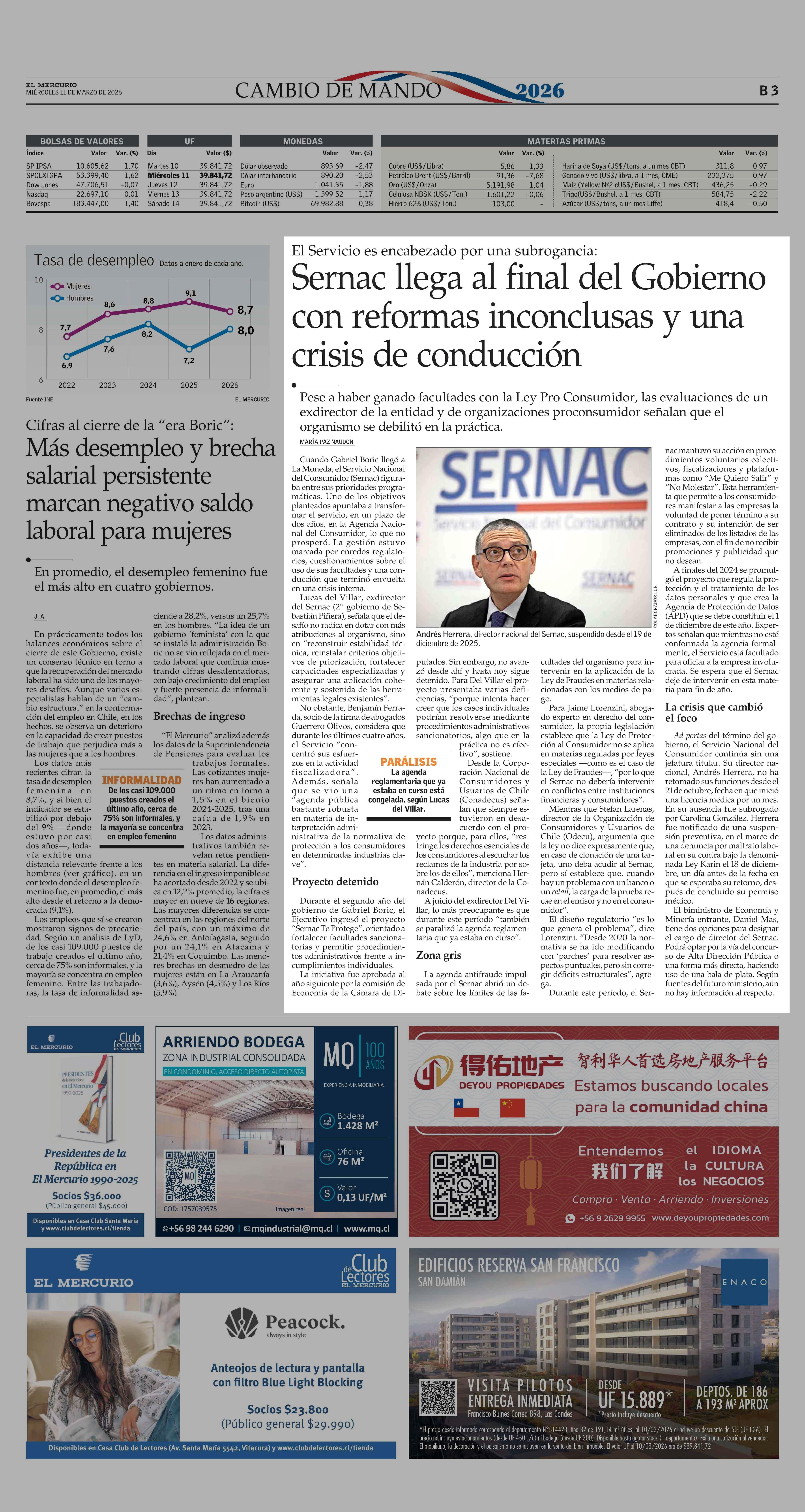 Sernac llega al final del Gobierno con reformas inconclusas y una crisis de conducción 11-03-2026 El Mercurio |