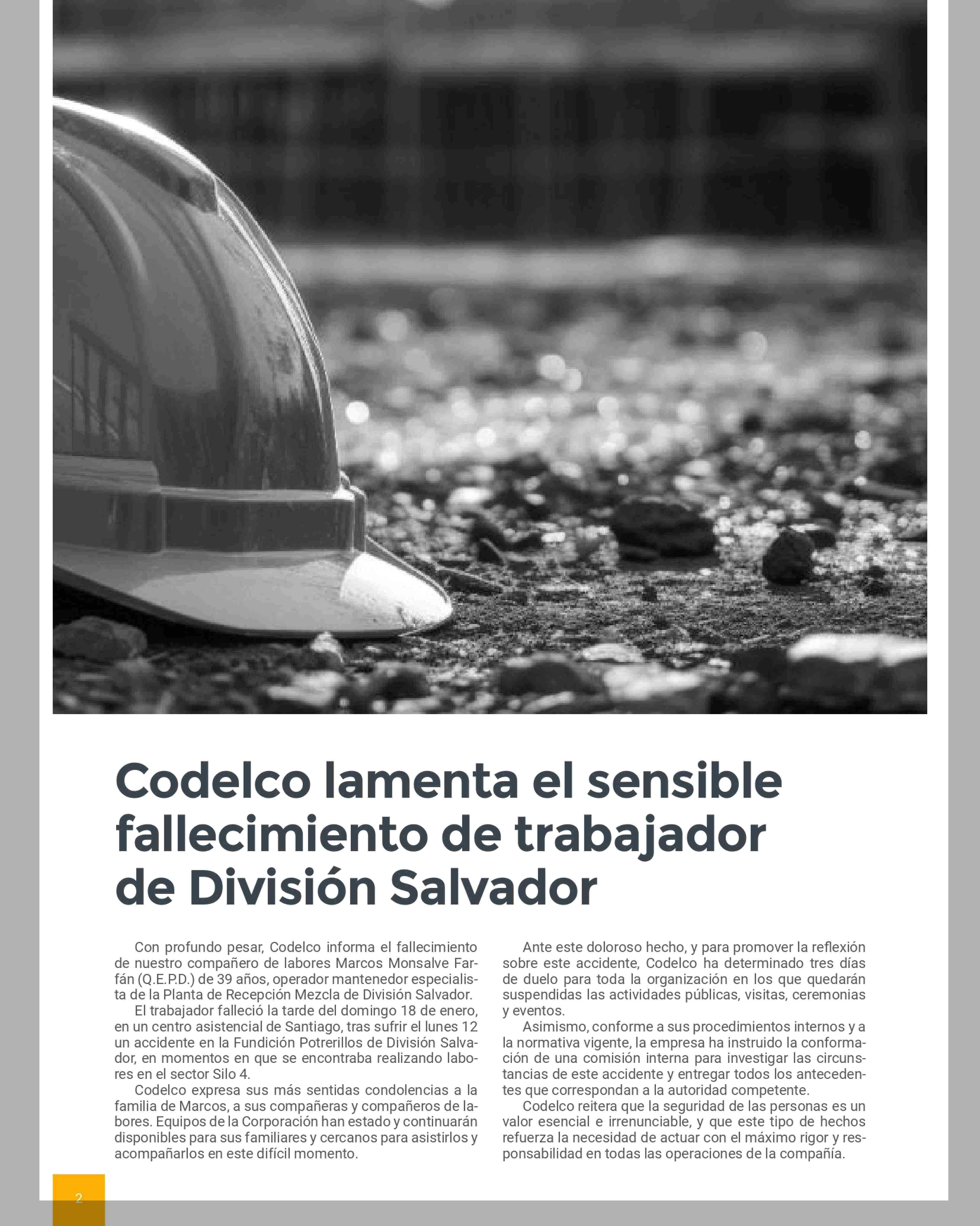 Título: Codelco lamenta el sensible fallecimiento de trabajador de División Salvador