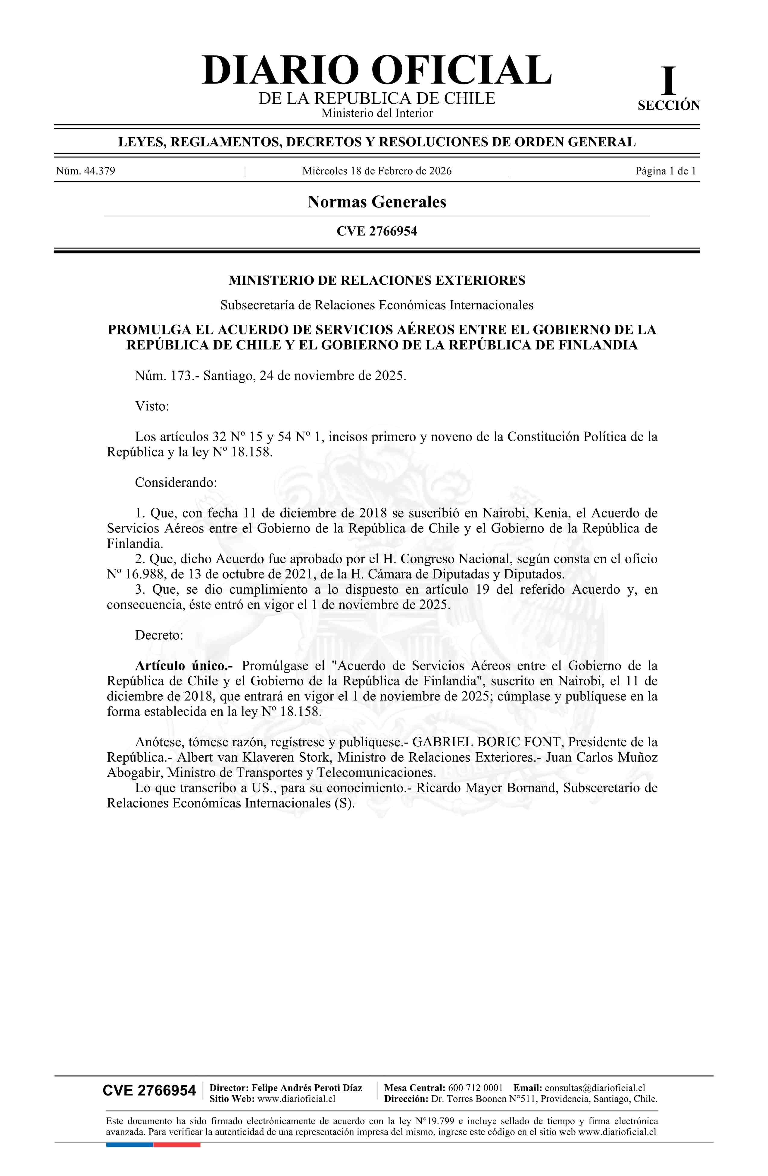 Decreto número 173, de 2025.- Promulga el Acuerdo de Servicios Aéreos entre el Gobierno de la República de Chile y el Gobierno de la República de Finlandia