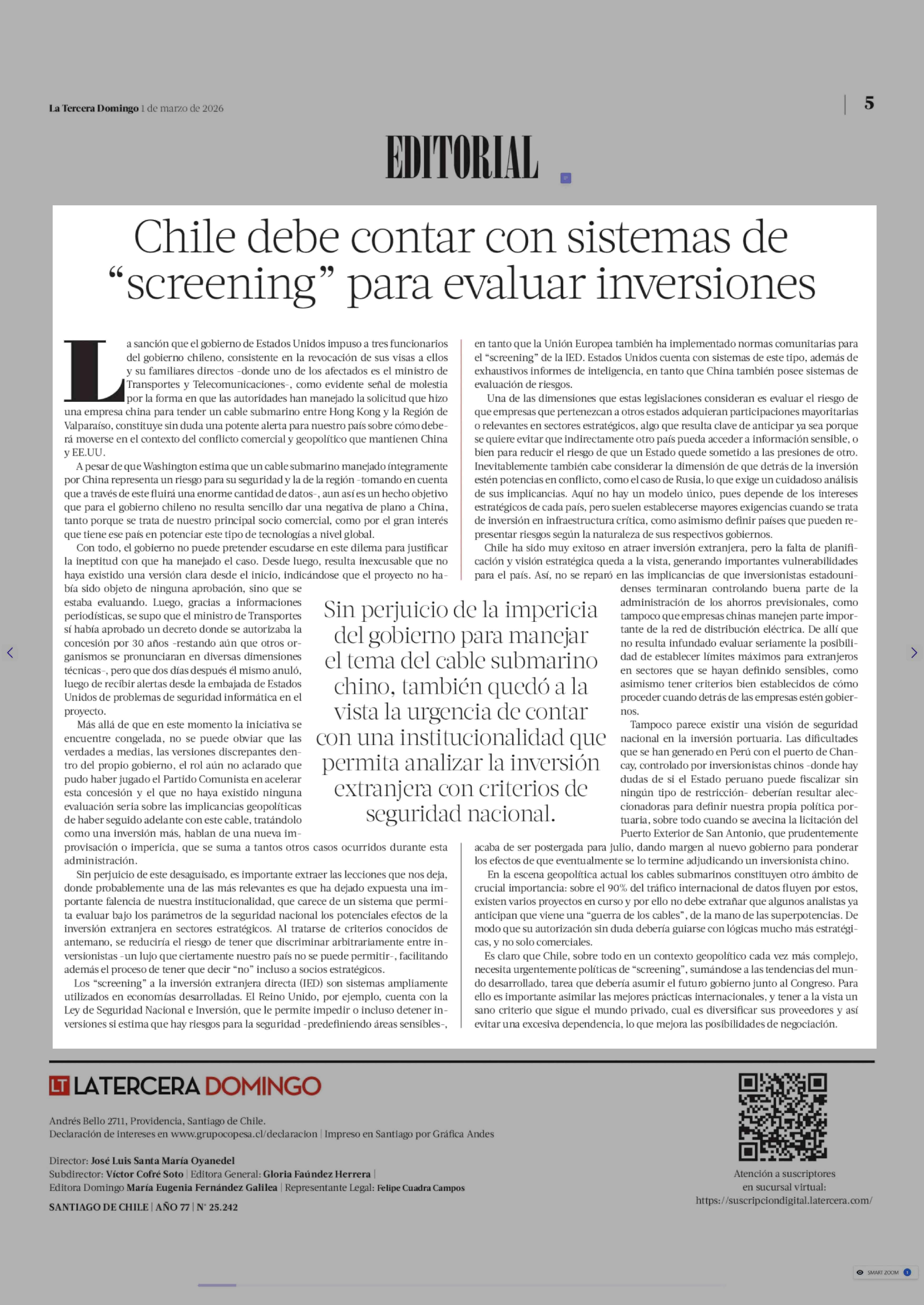 Editorial: Chile debe contar con sistemas de "screening" para evaluar inversiones 01-03-2026 La Tercera |
