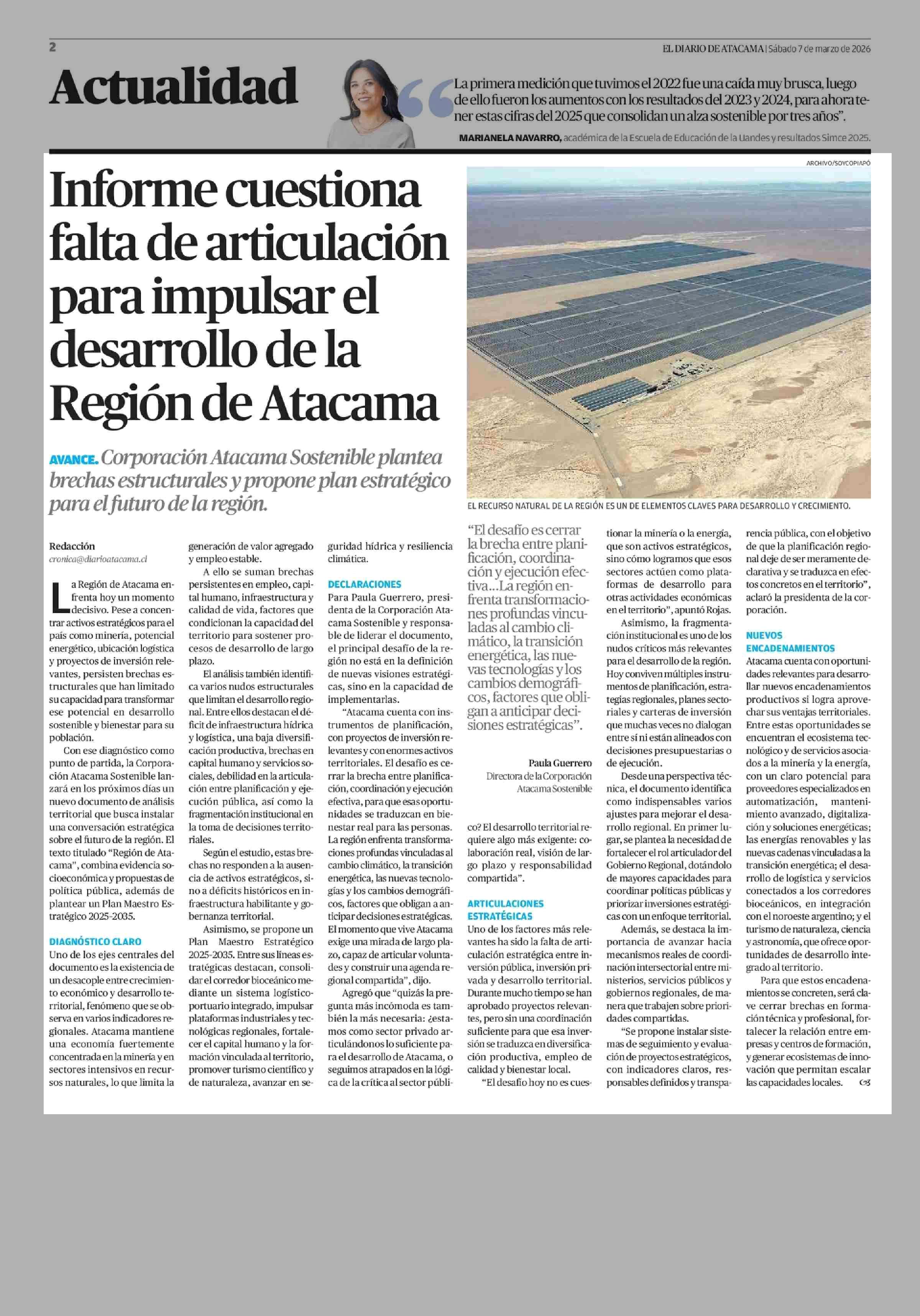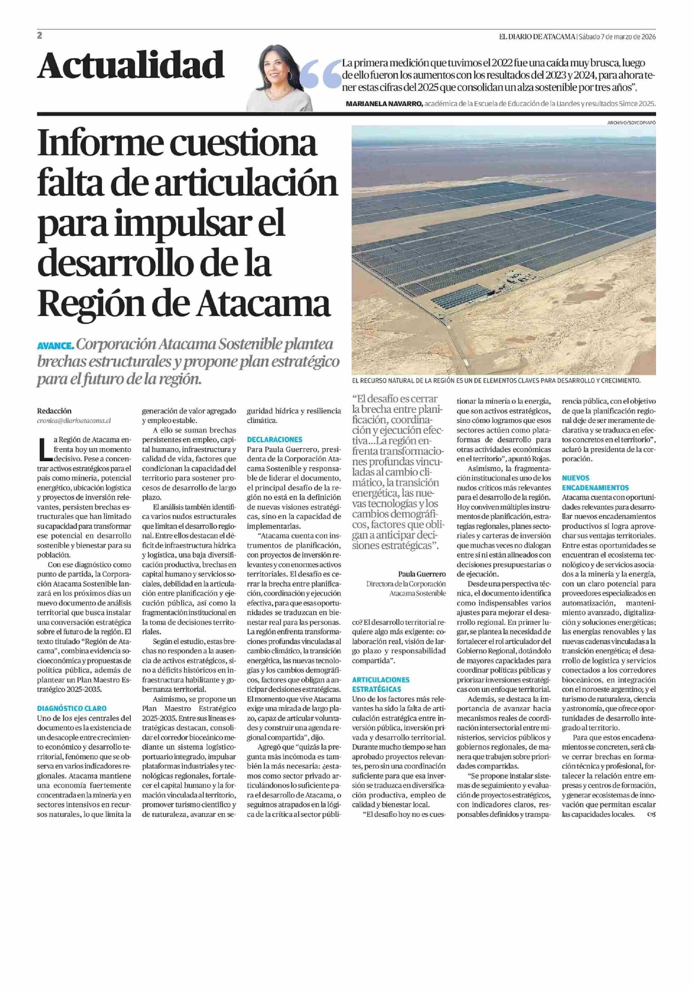 Informe cuestiona falta de articulación para impulsar el desarrollo de la Región de Atacama 07-03-2026 El Diario de Atacama |