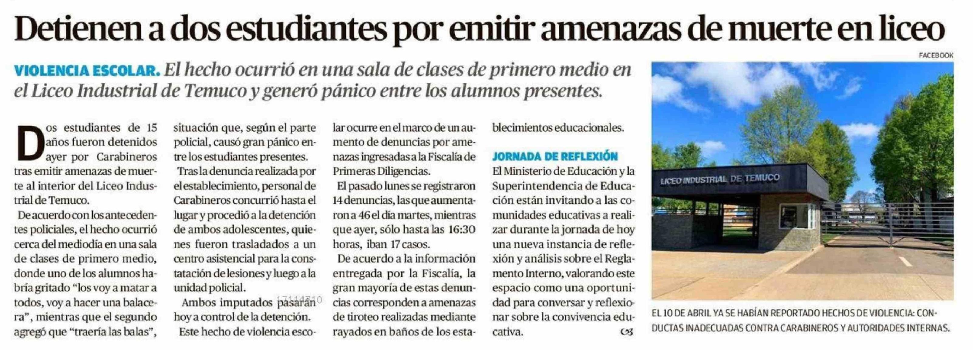 Título: Detienen a dos estudiantes por emitir amenazas de muerte en liceo