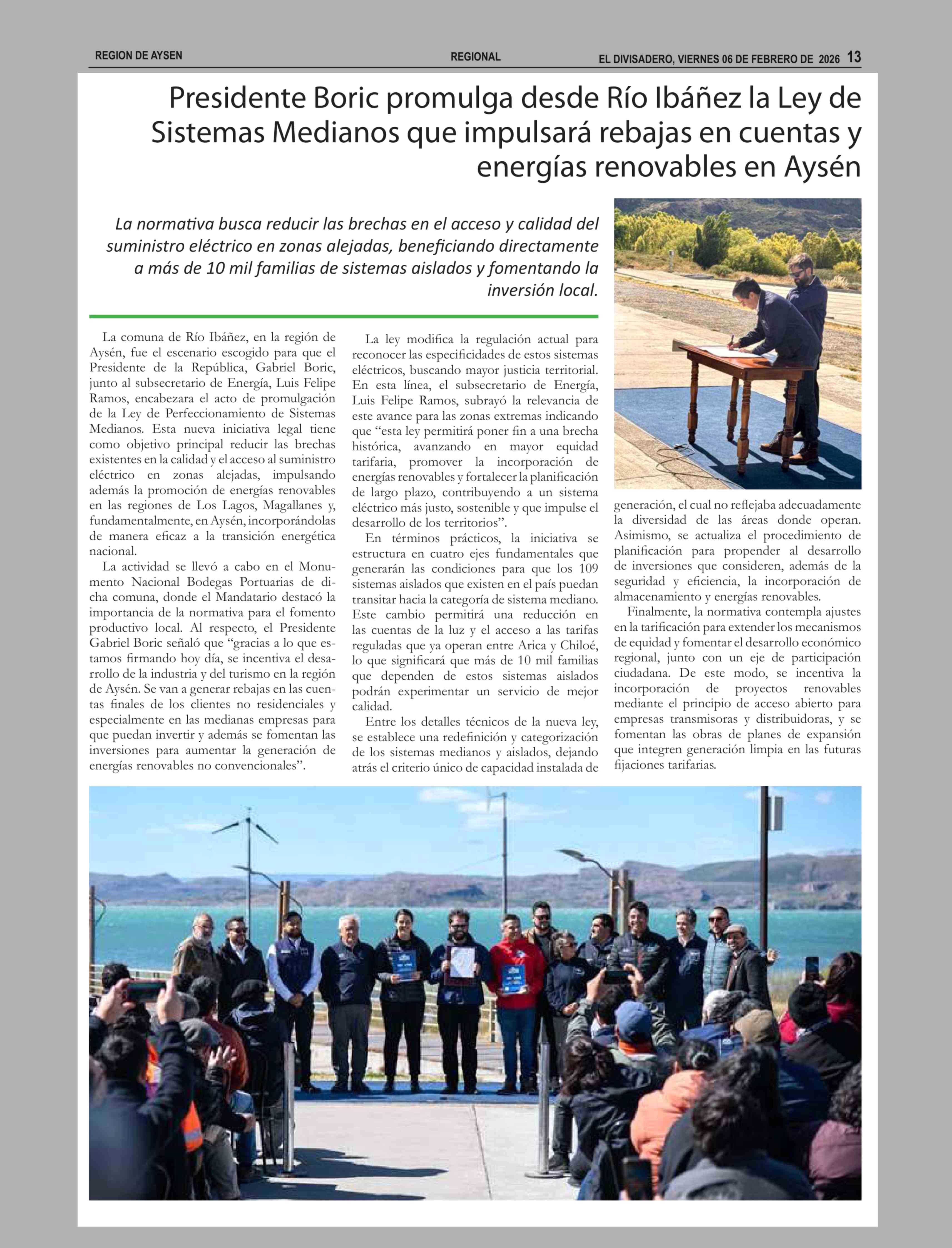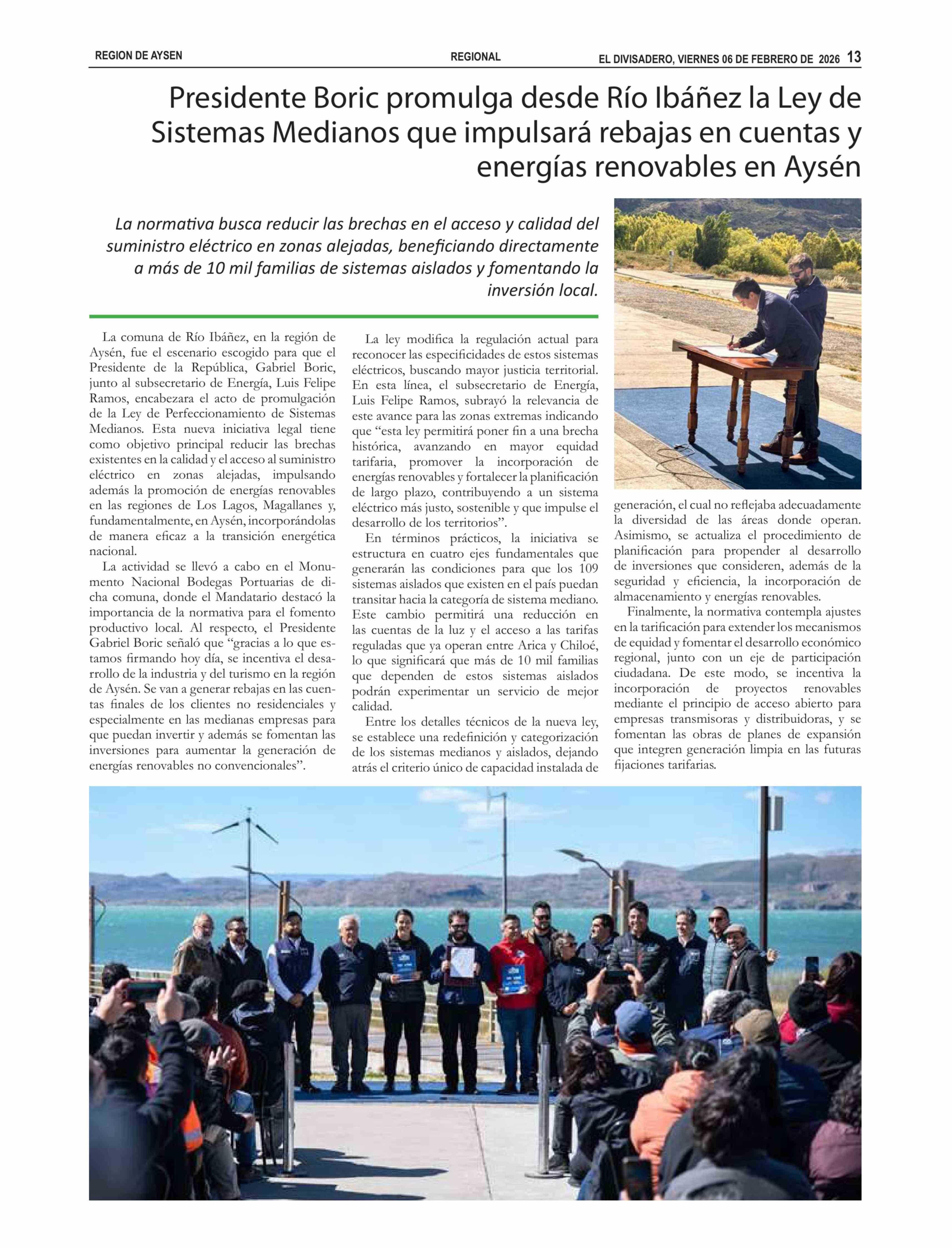 Presidente Boric promulga desde Río Ibáñez la Ley de Sistemas Medianos que impulsará rebajas en cuentas y energías renovables en Aysén 06-02-2026 El Divisadero |