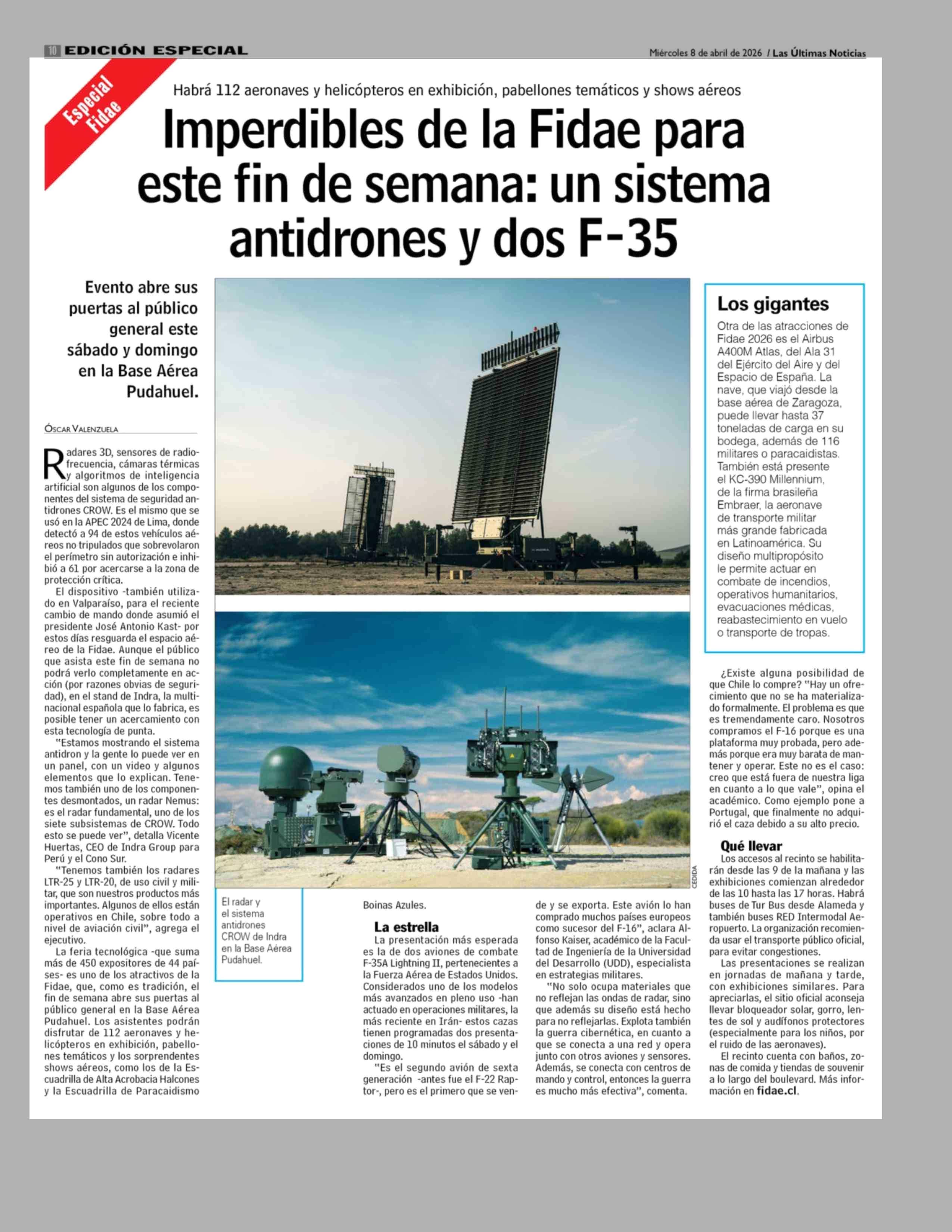 Imperdibles de la Fidae para este fin de semana: un sistema antidrones y dos F-35 08-04-2026 Las Últimas Noticias |