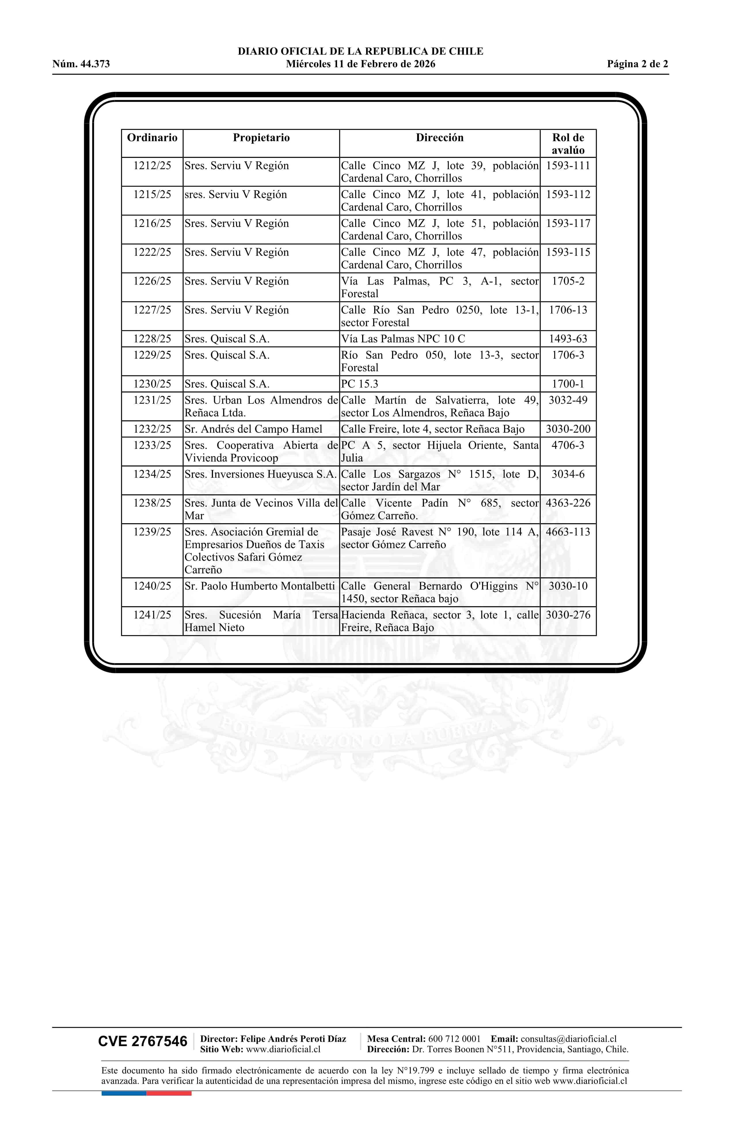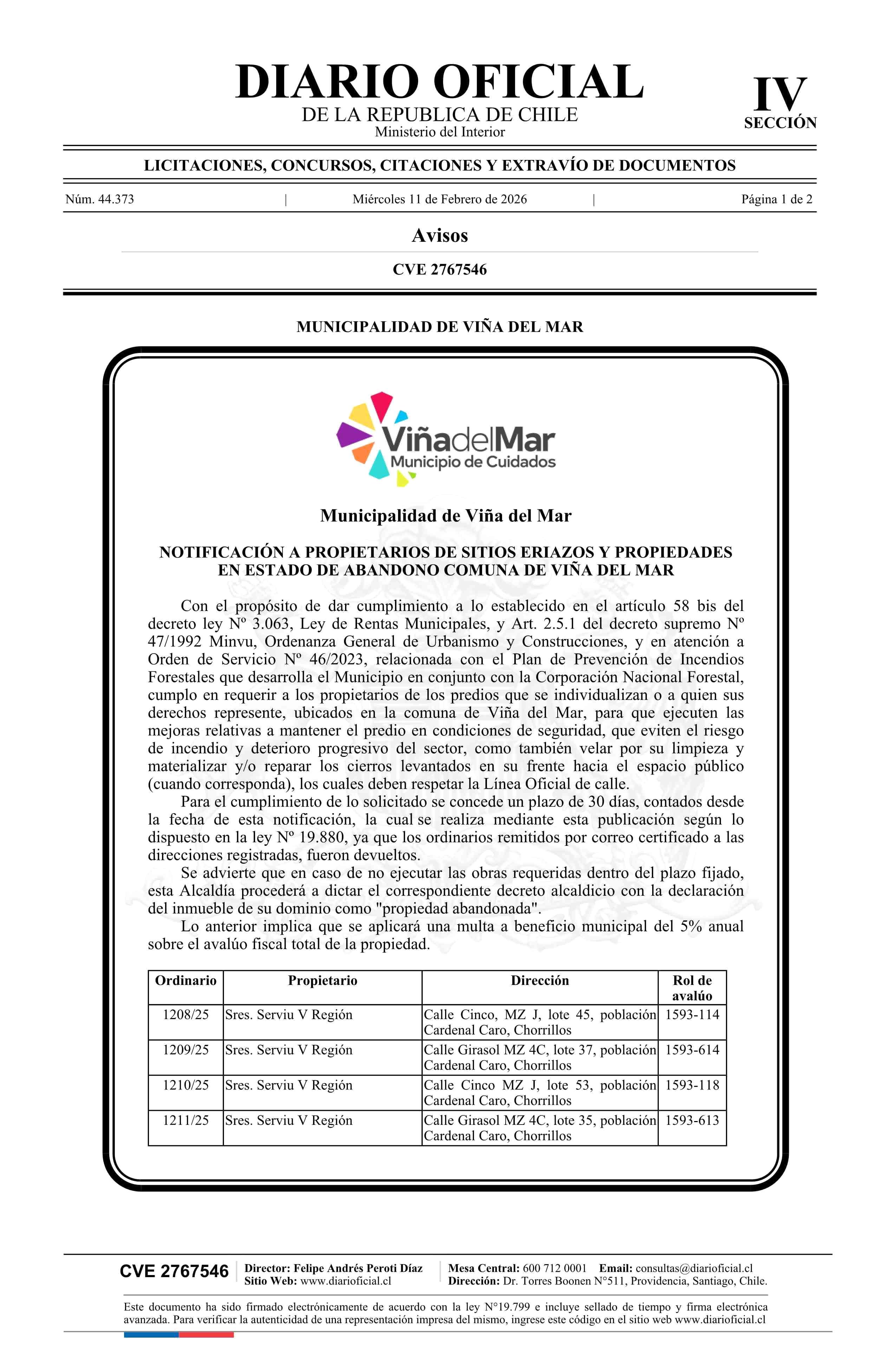 AVISO LICITACIONES: Notifica a propietarios de sitios eriazos y propiedades en estado de abandono lo que indica 11-02-2026 Diario Oficial Edición Electrónica |