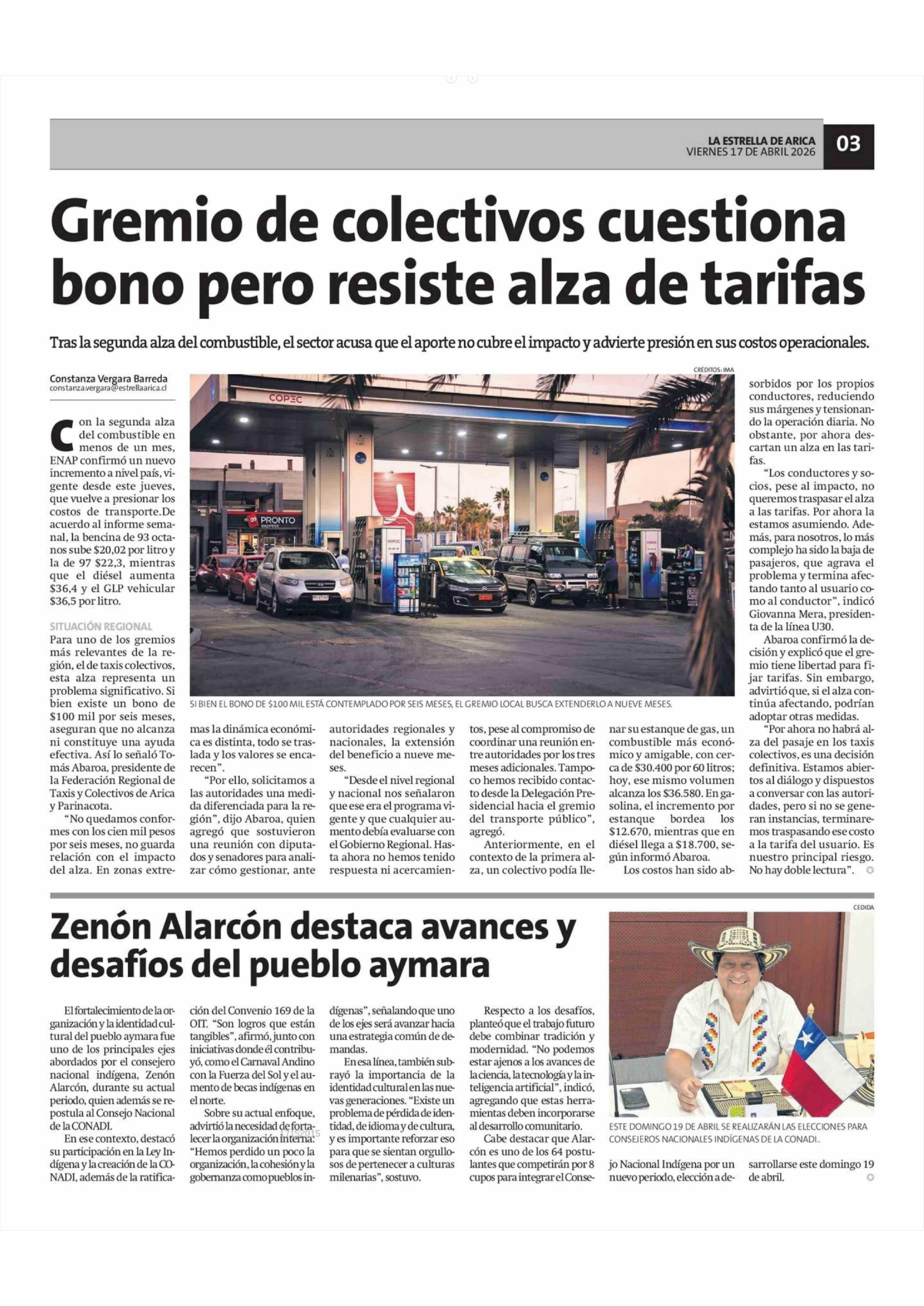 Gremio de colectivos cuestiona bono pero resiste alza de tarifas 17-04-2026 La Estrella de Arica |