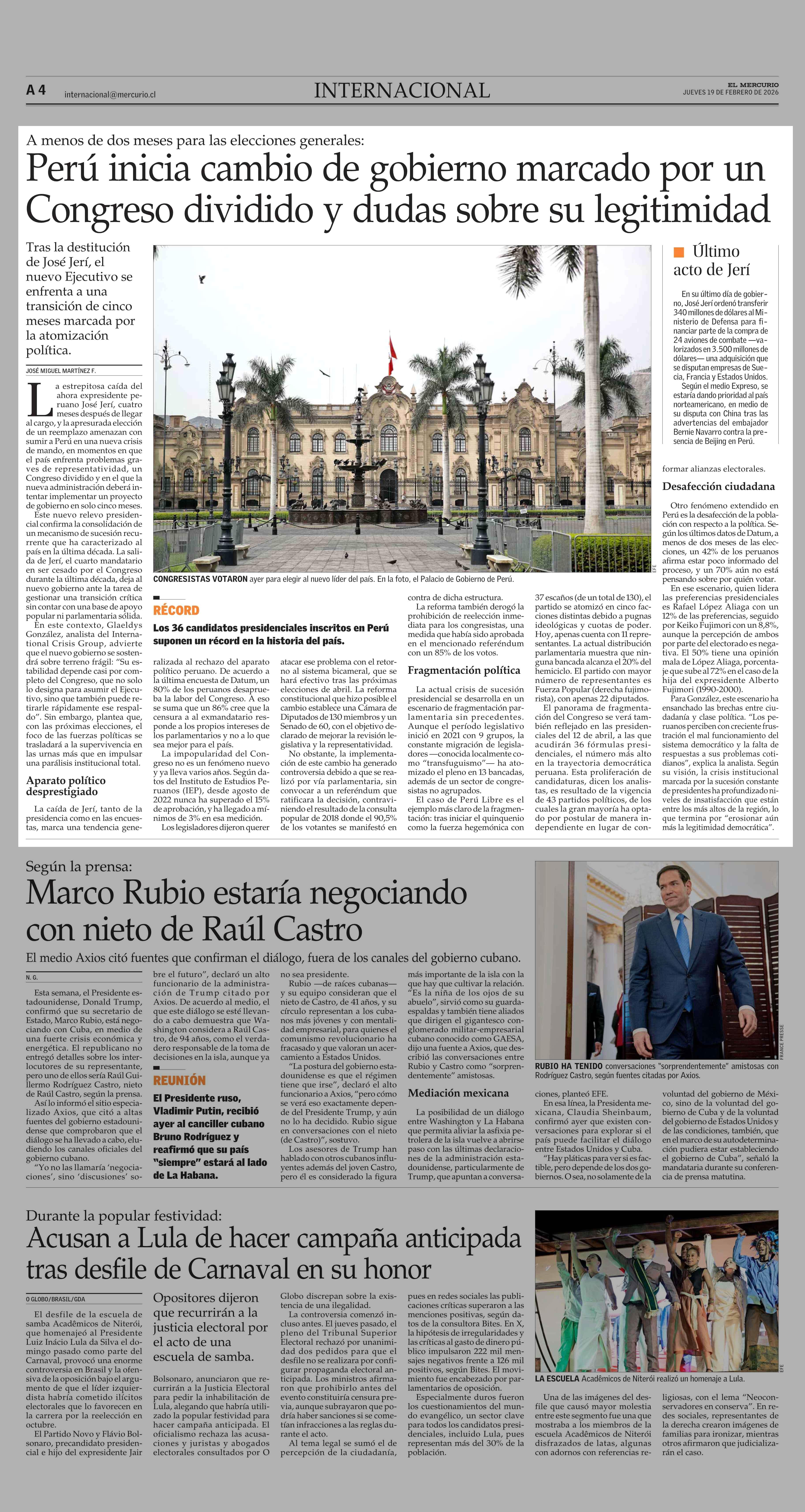 Perú inicia cambio de gobierno marcado por un Congreso dividido y dudas sobre su legitimidad 19-02-2026 El Mercurio |