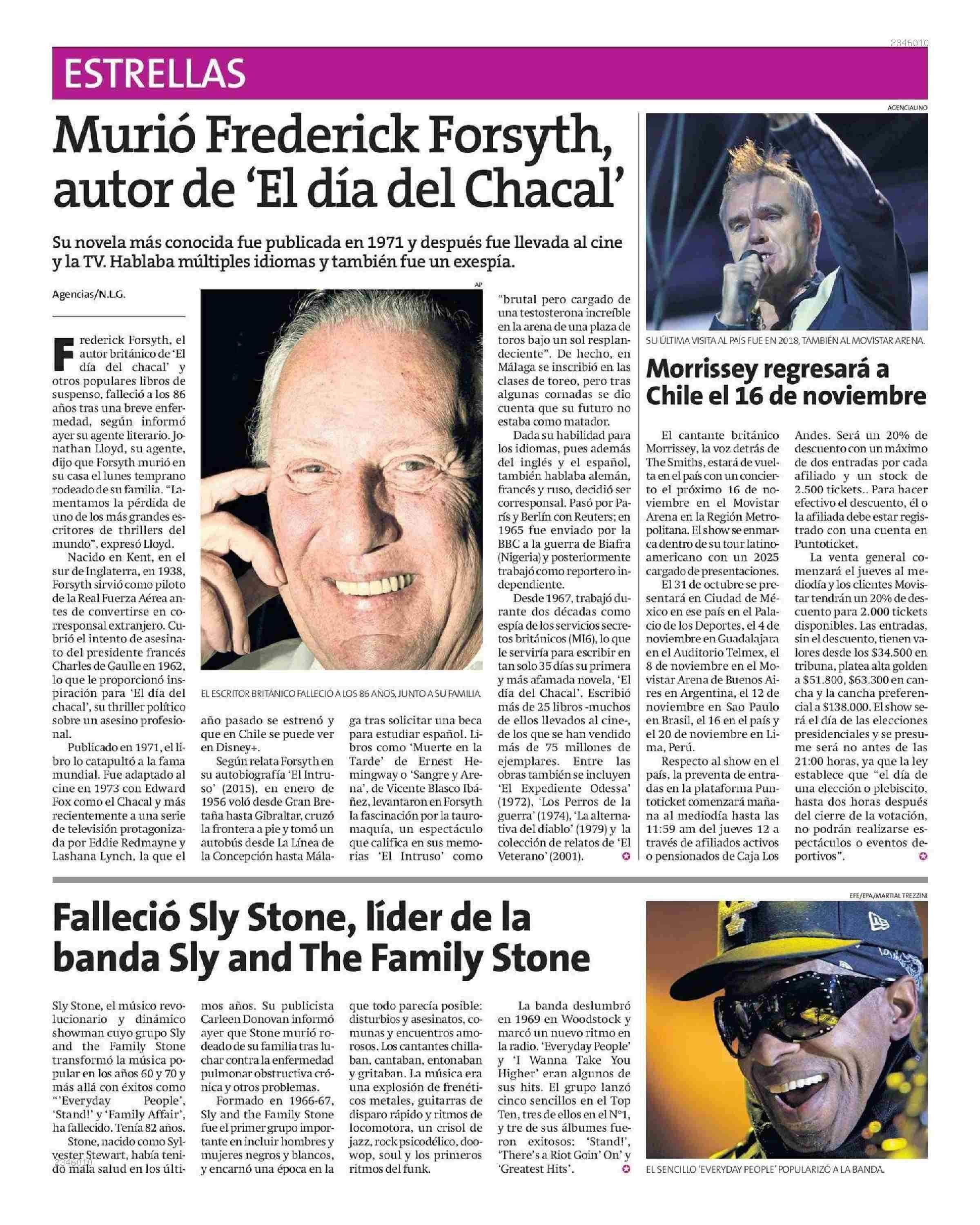 Murió Frederick Forsyth, autor de “El día del Chacal' 10-06-2025 La Estrella de Iquique |