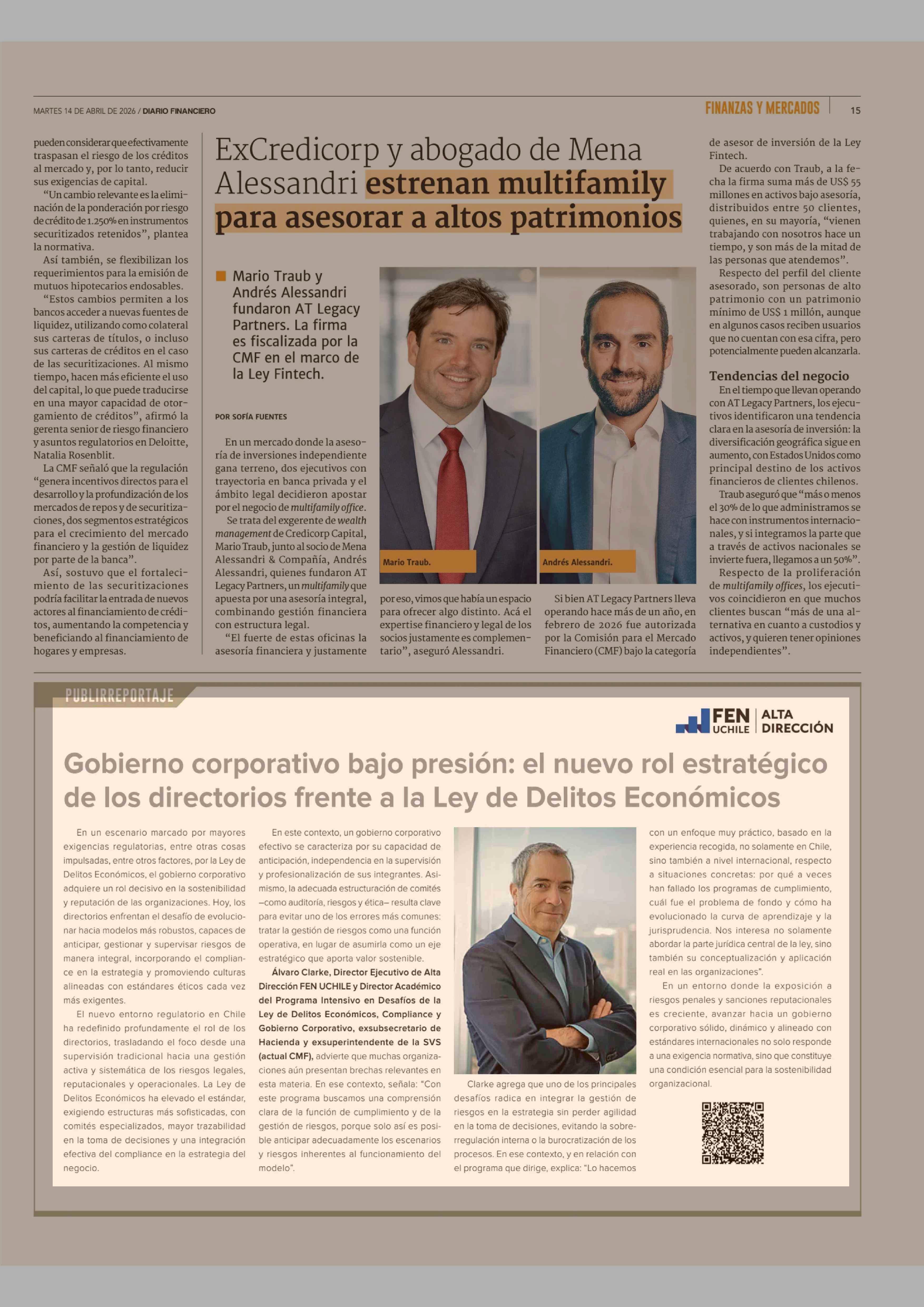 Gobierno corporativo bajo presión: el nuevo rol estratégico de los directorios frente a la Ley de Delitos Económicos 14-04-2026 Diario Financiero |