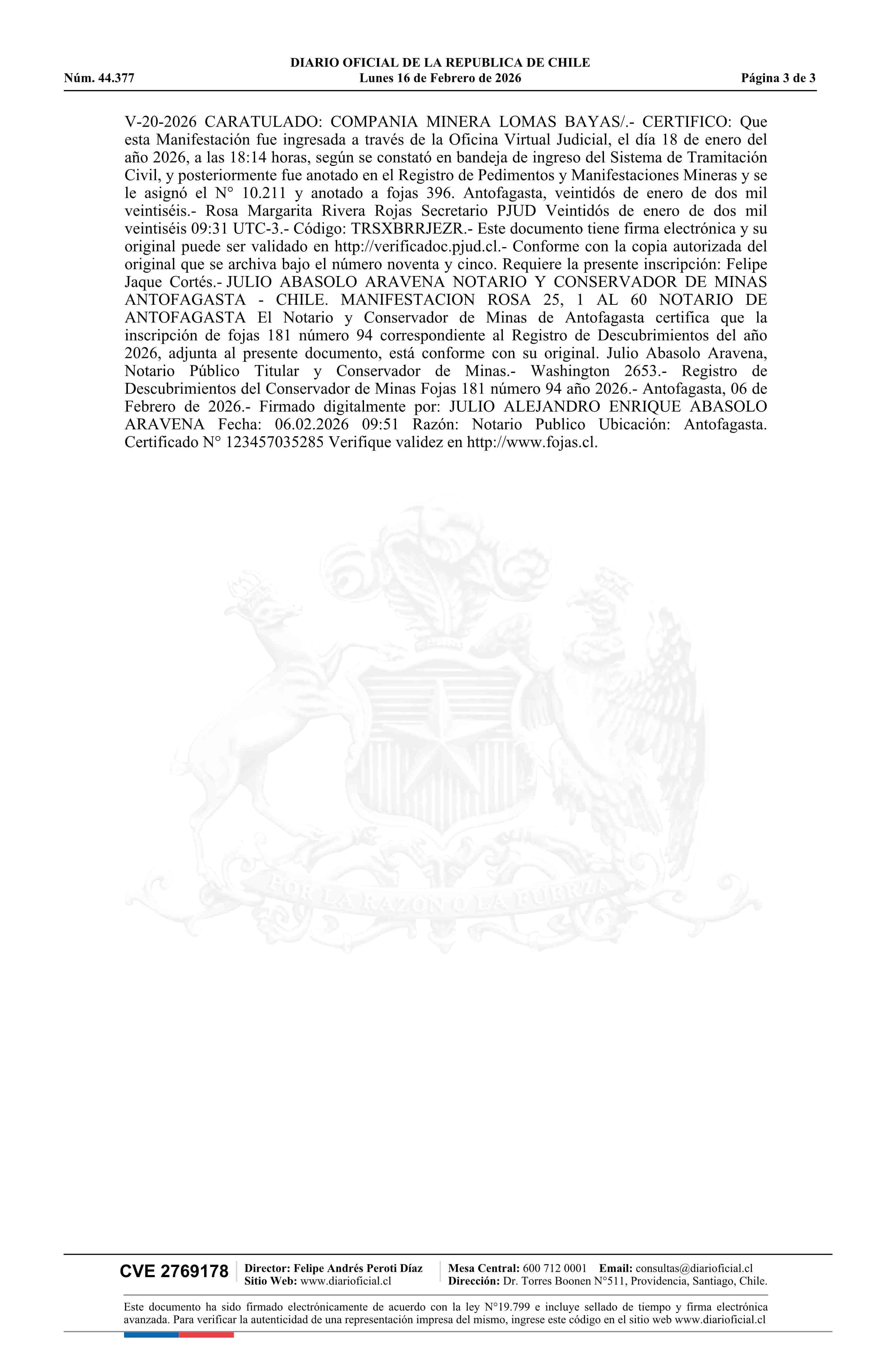 ROSA 25, 1 AL 60 / Compañía Minera Lomas Bayas 16-02-2026 DIARIO OFICIAL CHILE - BOLETÍN OFICIAL DE MINERÍA |