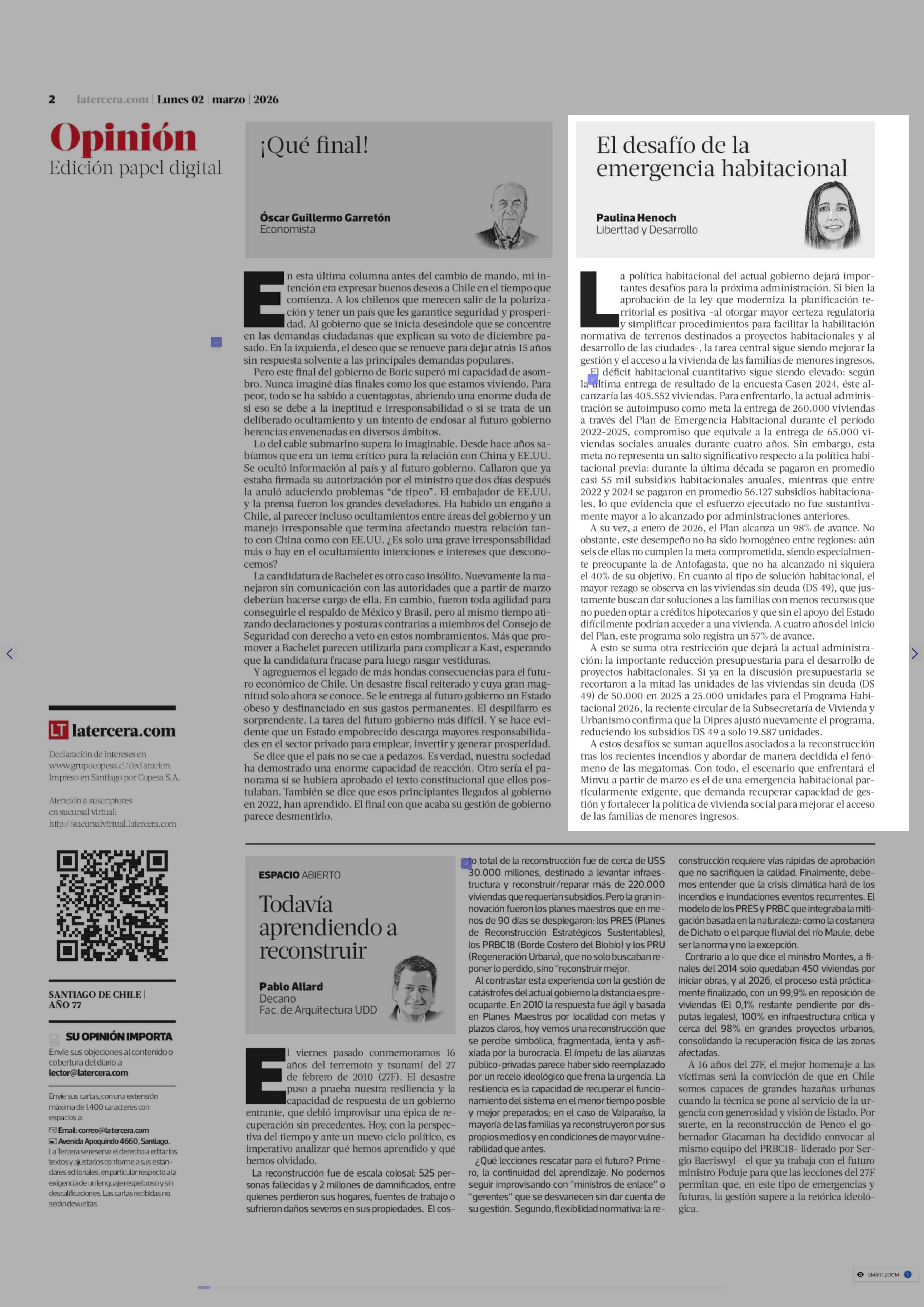 COLUMNAS DE OPINIÓN: El desafío de la emergencia habitacional 02-03-2026 La Tercera |