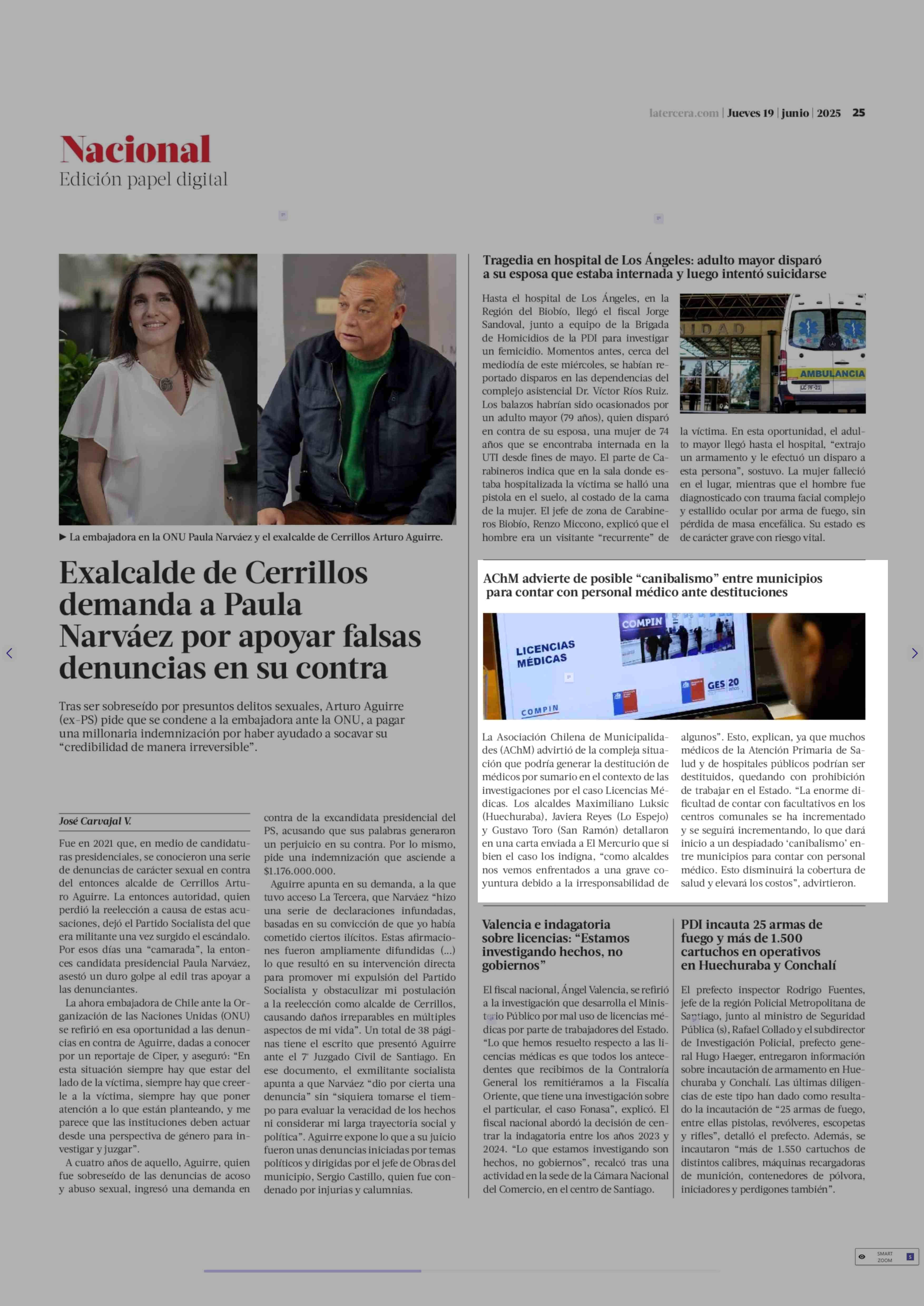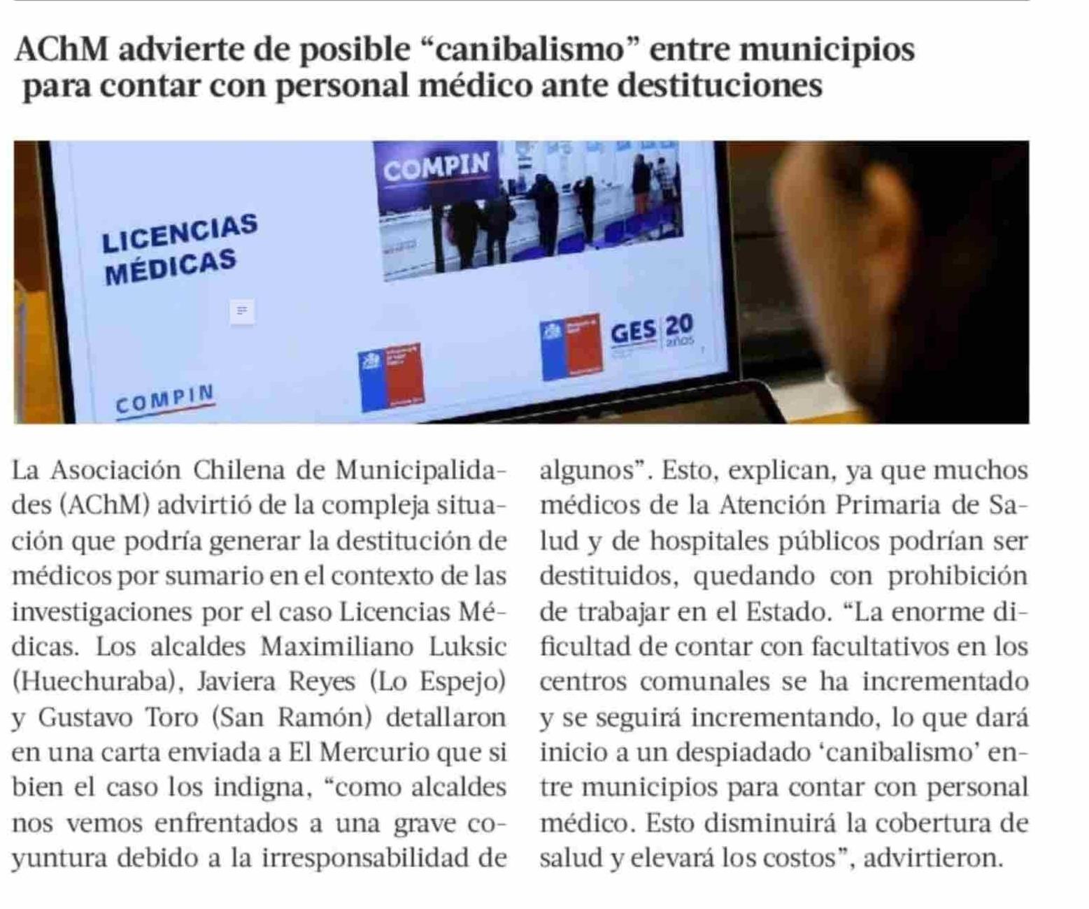 AChM advierte de posible “canibalismo” entre municipios para contar con personal médico ante destituciones 19-06-2025 La Tercera |