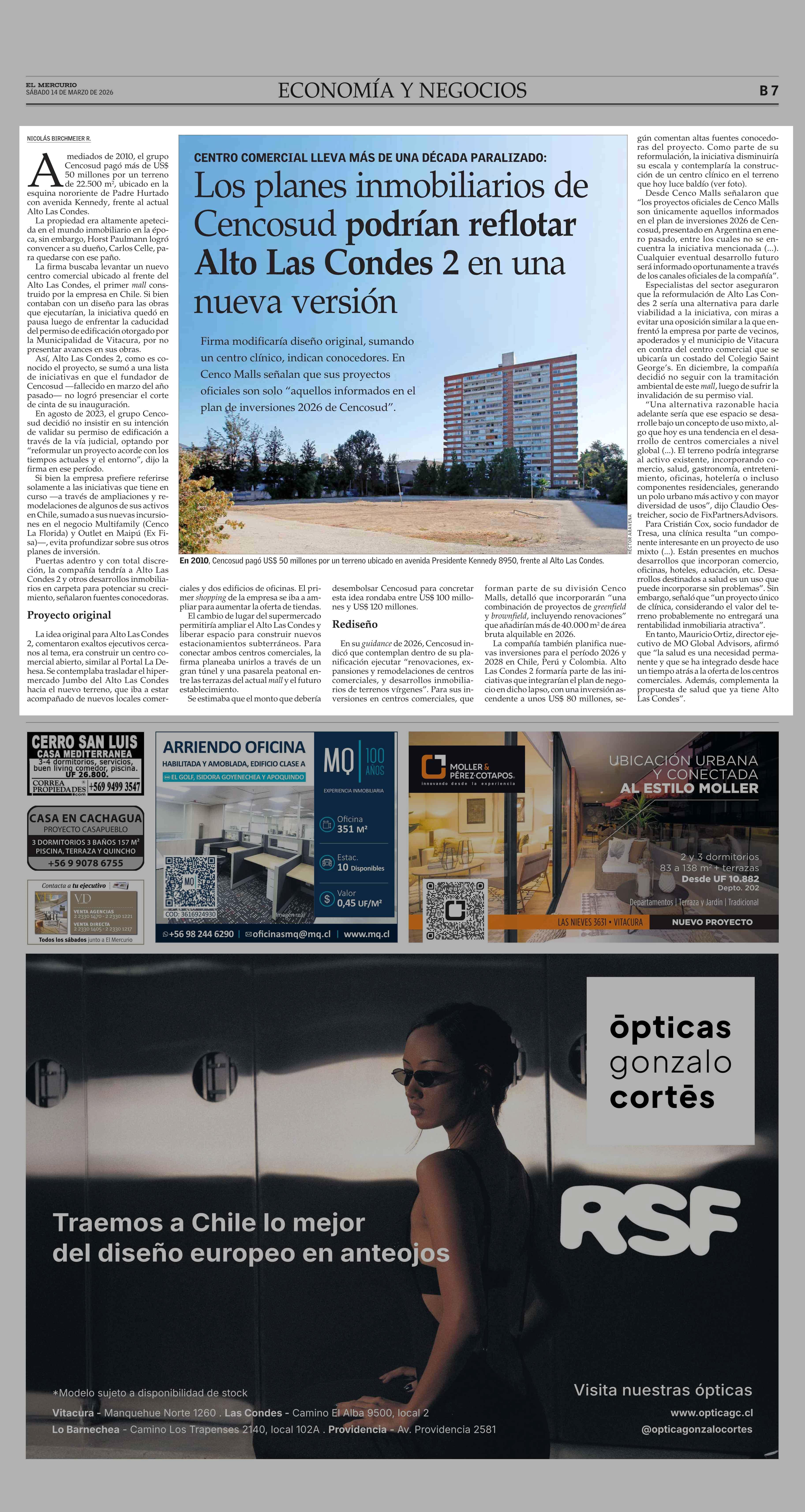 Los planes inmobiliarios de Cencosud podrían reflotar Alto Las Condes 2 en una nueva versión 14-03-2026 El Mercurio |