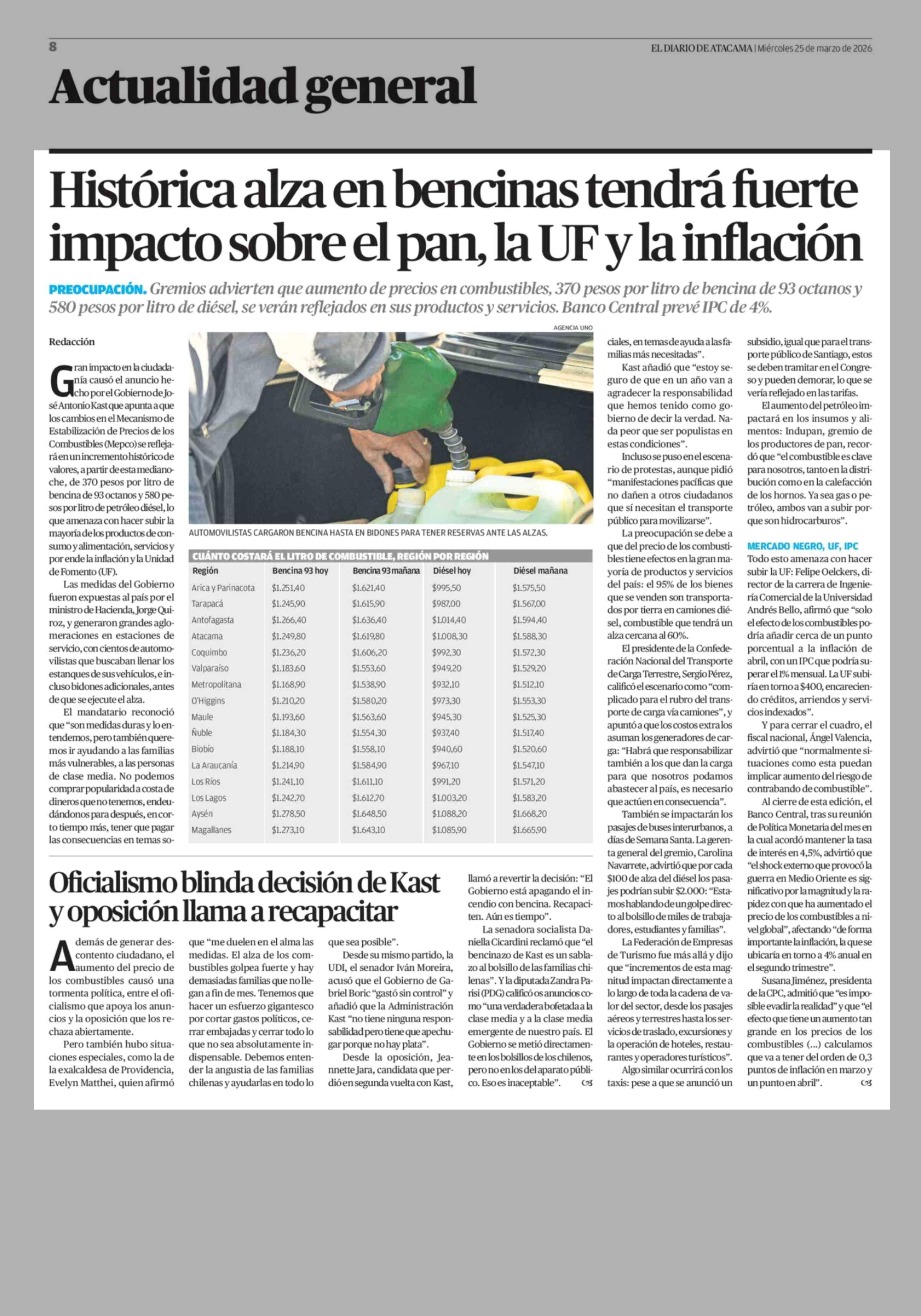 Histórica alza en bencinas tendrá fuerte impacto sobre el pan, la UF y la inflación 25-03-2026 El Diario de Atacama |