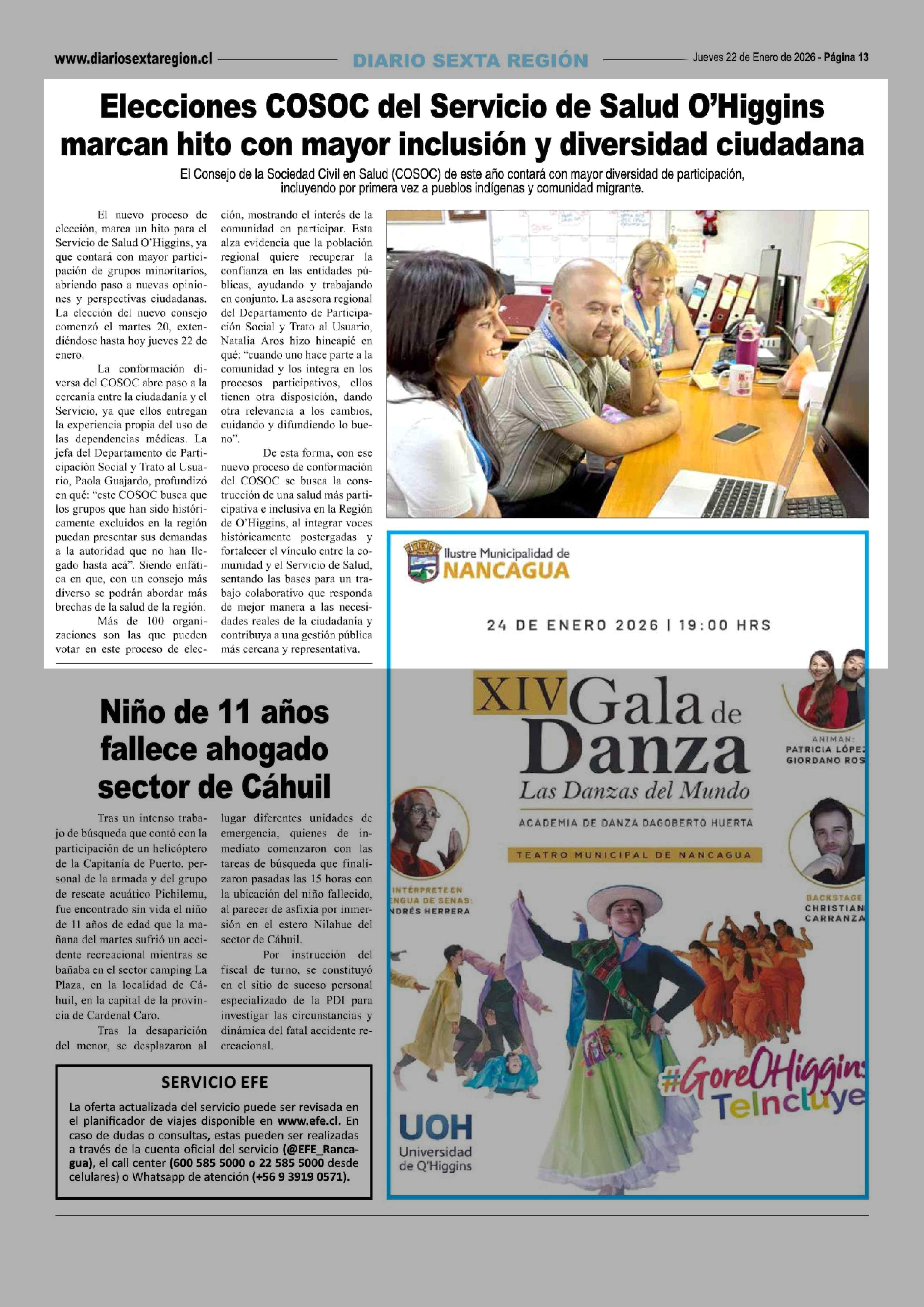 | Fecha: | 22-01-2026 | Sector: | Noticia general | Región: | Región del Libertador General Bernardo O'Higgins |