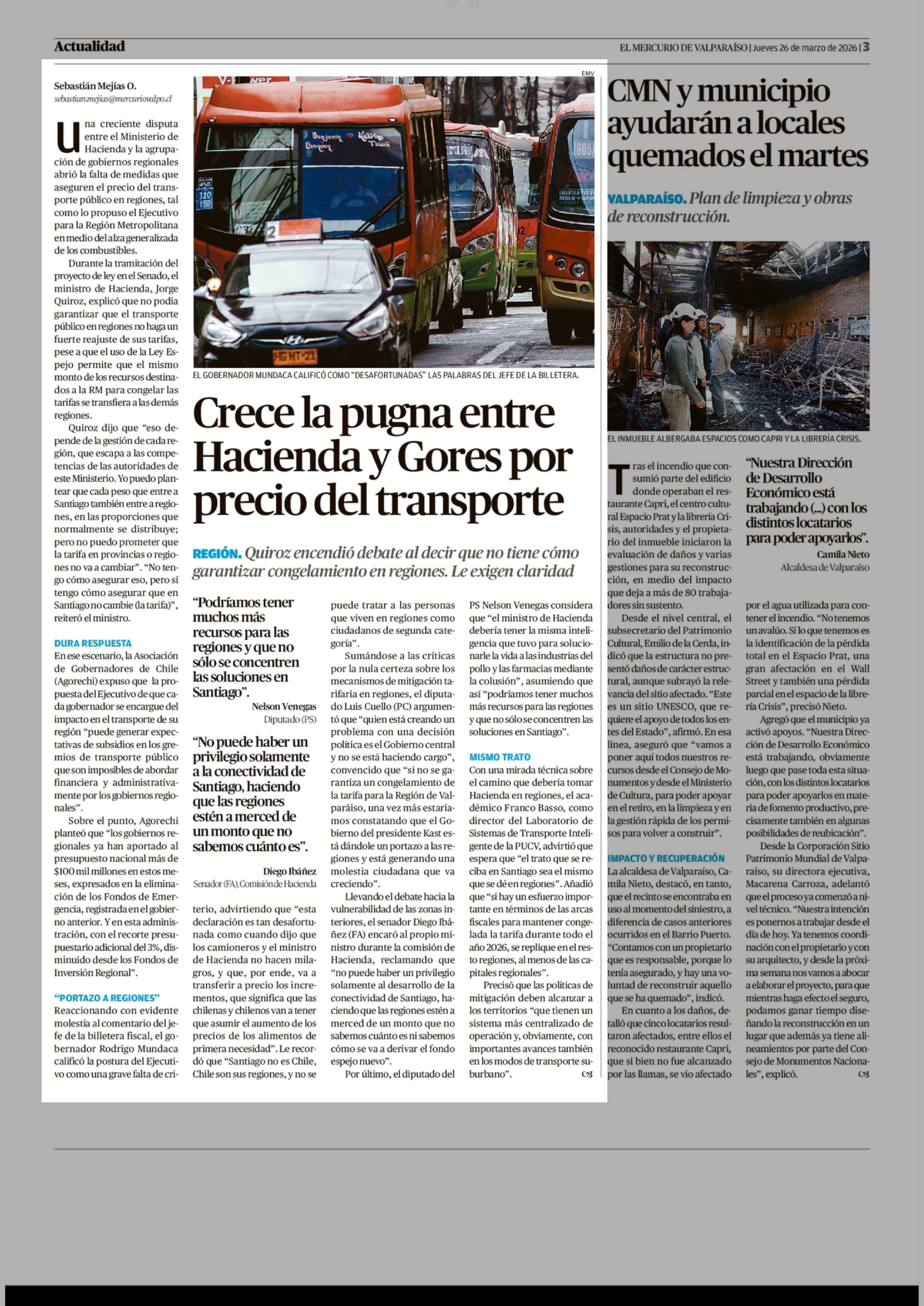 Crece la pugna entre Hacienda y Gores por precio del transporte 26-03-2026 El Mercurio de Valparaíso |