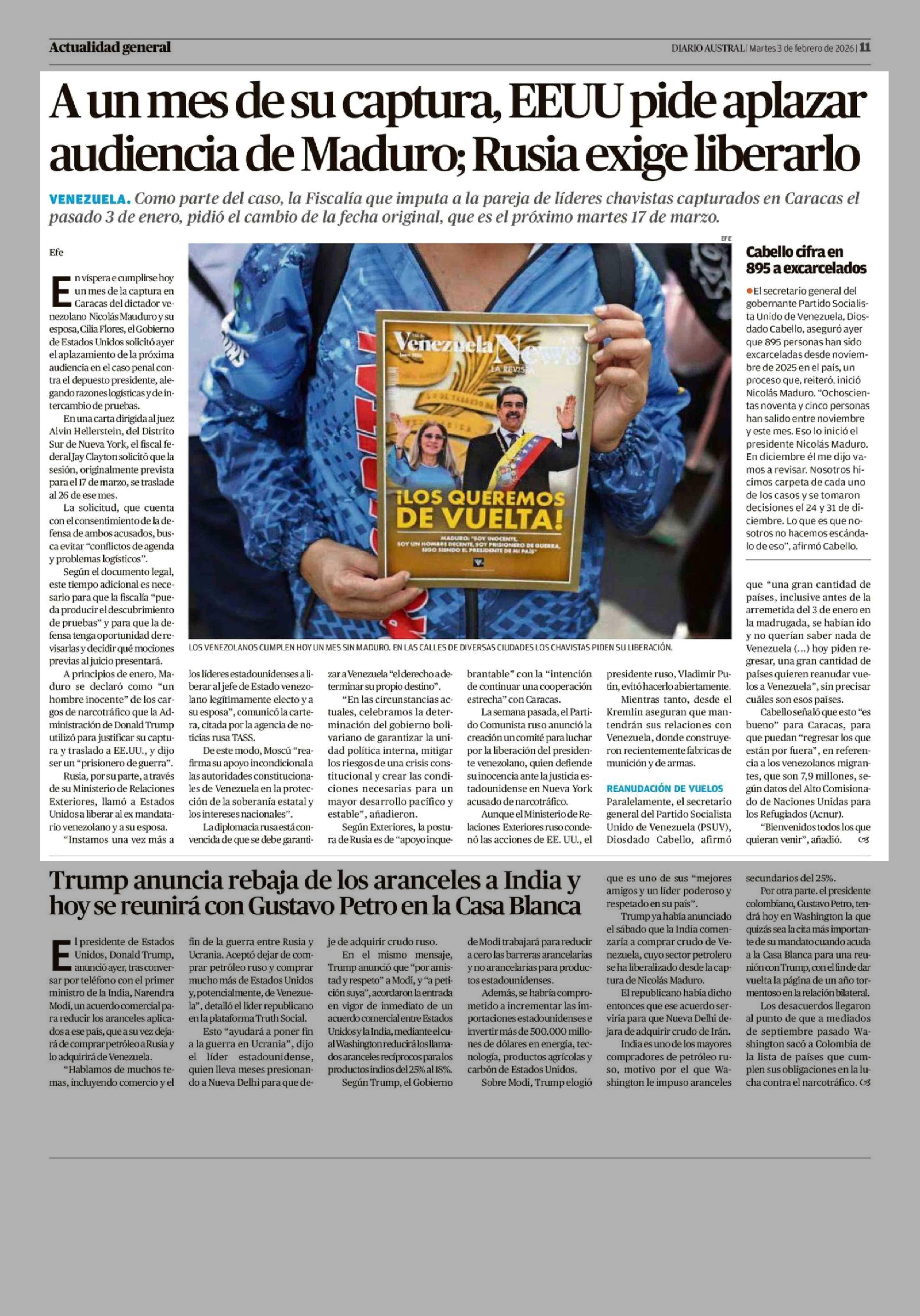 Título: A un mes de su captura, EEUU pide aplazar audiencia de Maduro; Rusia exige liberarlo