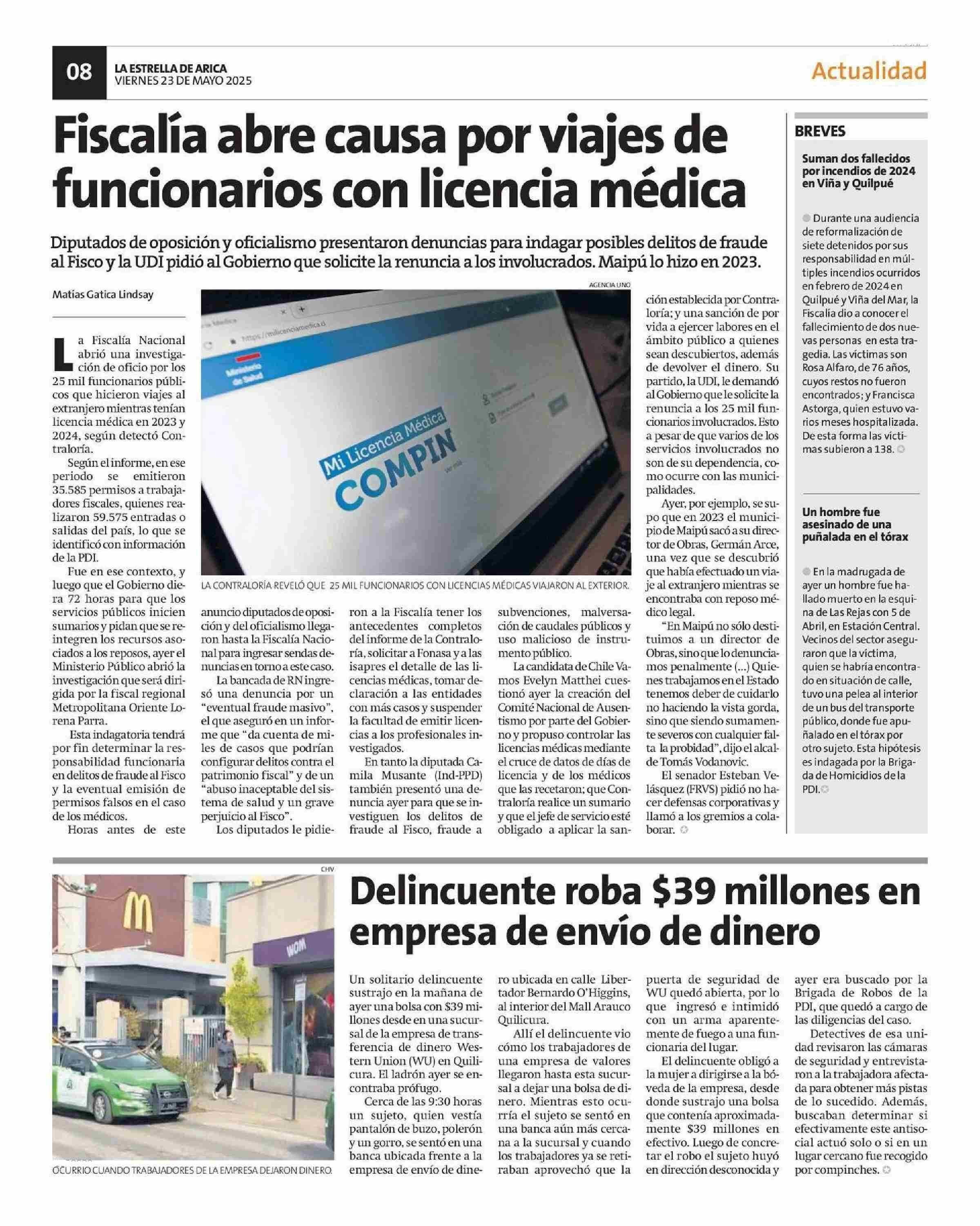 Fiscalía abre causa por viajes de funcionarios con licencia médica 23-05-2025 La Estrella de Arica |